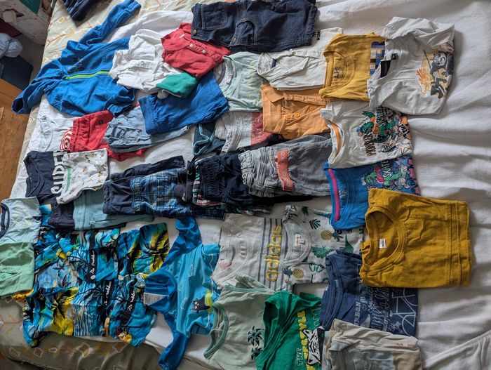 47 pièces composé de 31 tee shirt, 11 shorts, une combinaison de bain, un gilet, une chemise, une salopette, un ensemble chemise short leger Toutes marques: catimini, bout'chou la compagnie des petits, okaidi, orchestra