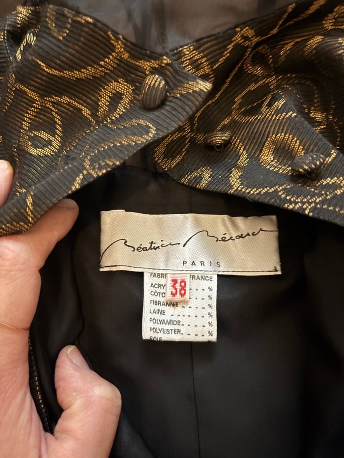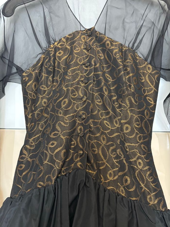 Je vends cette élégante robe de soirée vintage noire avec un motif doré. Taille : 38 - M Couleur : Noir et doré Motif : Doré et tulle Matière : polyester et tulle Hauteur : 104 cm Fermeture à boutons sur le devant. Haut de la robe en léger corset Marque: Béatrice becault