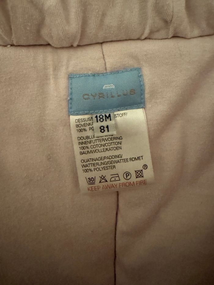 Je vends une très jolie combinaison pilote Cyrillus, taille 18 mois (81 cm). * Couleur : rose poudré très doux * Capuche intégrée * Moufles et chaussons intégrés *Doublure 100% coton * Rembourrage chaud (idéal hiver) * Fermeture pratique à pressions sur le devant Parfaite pour garder bébé bien au chaud en poussette ou lors des sorties d'hiver V Très bon état V Pas de taches ni accrocs Remise en main propre possible ou envoi à votre charge