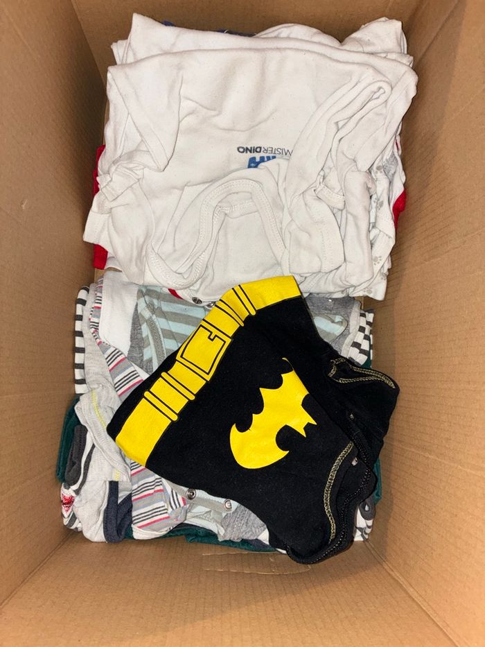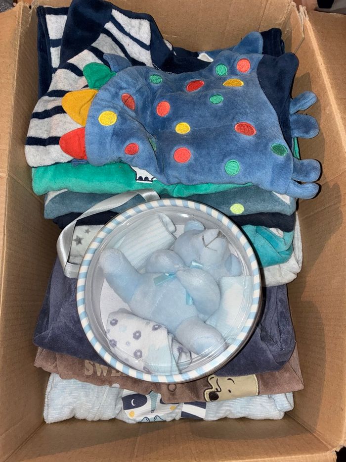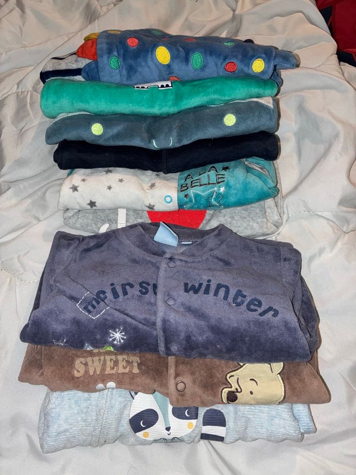 Taille du 6 /9/12 mois une pièces 18 mois Bodies manches courte et manche longue Pyjama chaud très bon état Je vend le carton complet