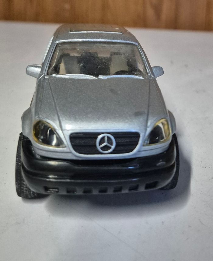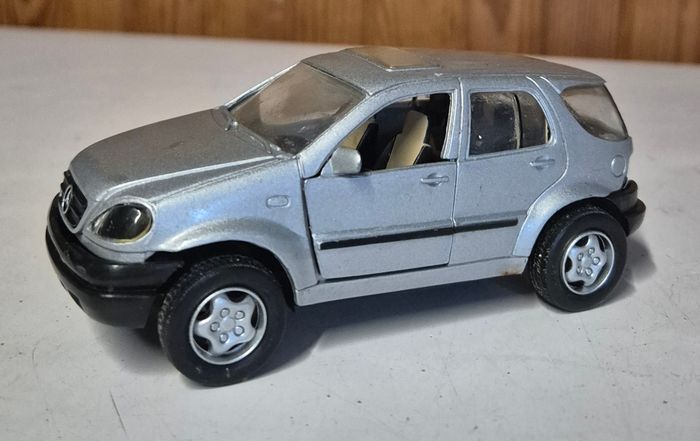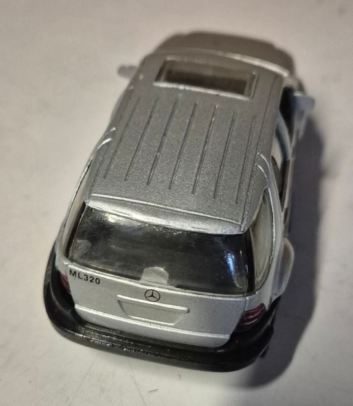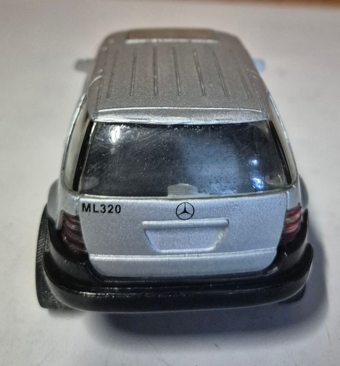 Modèle réduit Mercedes-Benz ML320 de la marque New Ray, finition argentée avec détails de carrosserie, logo Mercedes à l’avant et à l’arrière, marquage ML320 sur le hayon et châssis portant la mention Benz M. Class. Intérieur visible à travers les vitres, roues fonctionnelles et pare-chocs noirs. Modèle adapté à la collection, à l’exposition ou au jeu. Fabrication New Ray, Made in China. Format standard d’un modèle réduit type 1/64. Etat conformes aux photos. Rayure visible #newray #mercedes #ml320 #modelereduit #voitureminiature #suvminiature #mercedesbenz #collectionminiature #diecastcar #modelcar #miniaturecar