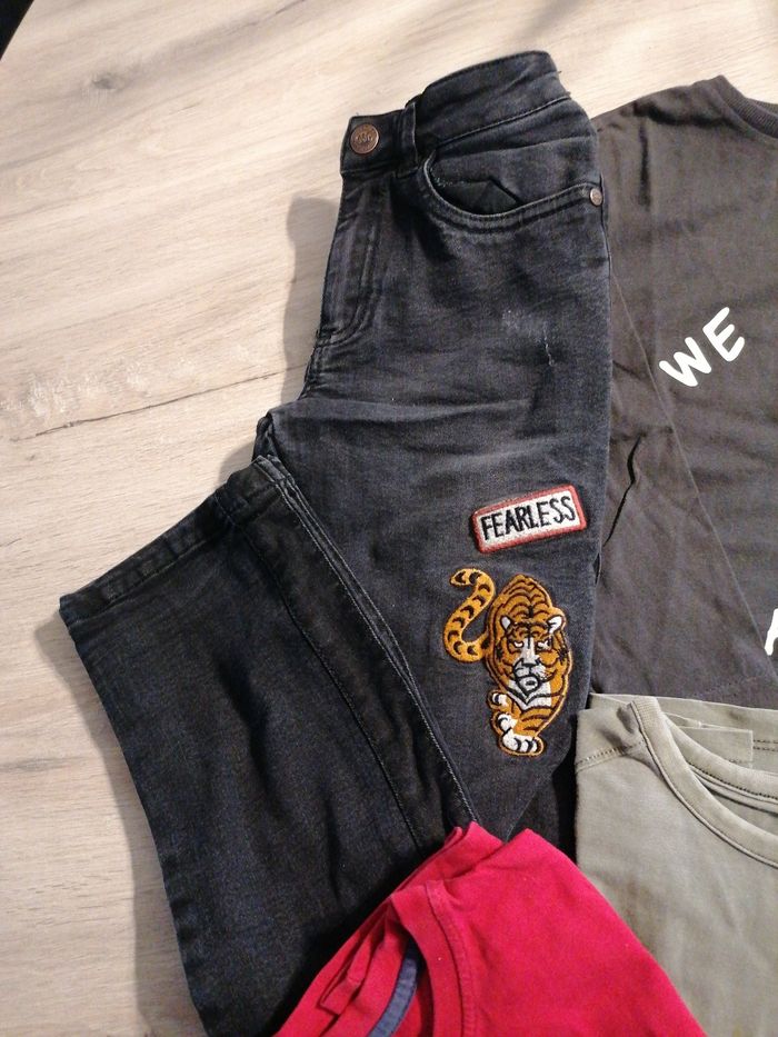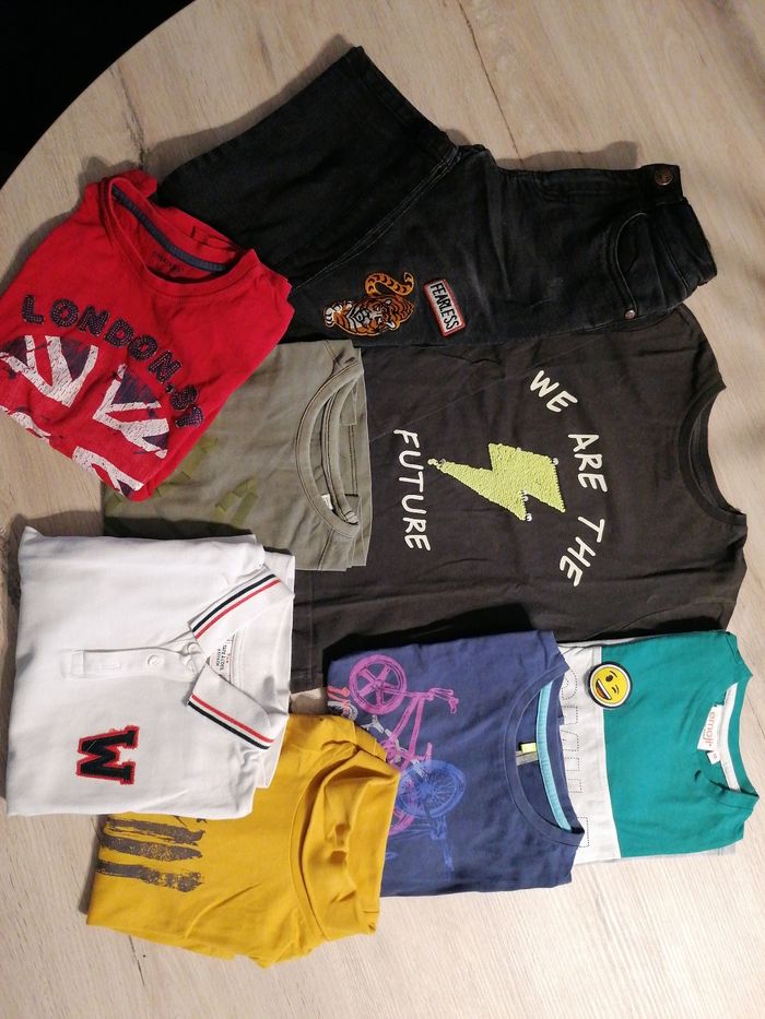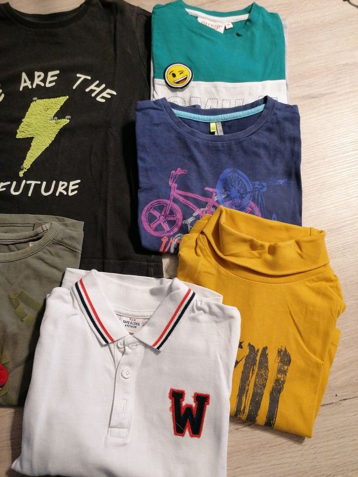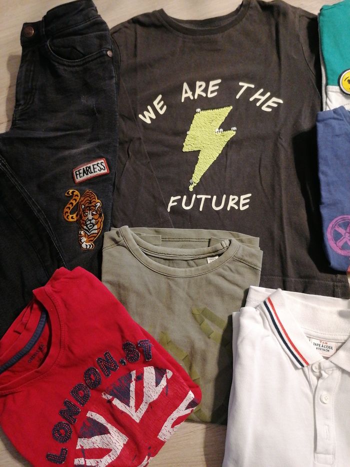 Un jeans noir 7 ans orchestra 3 tee shirts manches longues (1 avec sequins) Un polo manches longues Tao Tee shirt manches courtes vert smiley Tee shirt manches courtes dessin velo Un sous pull moutarde Tape À L'oeil Tout en très bon état