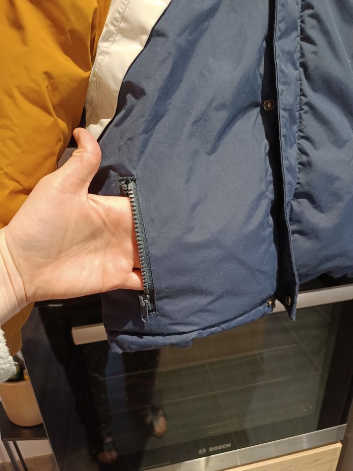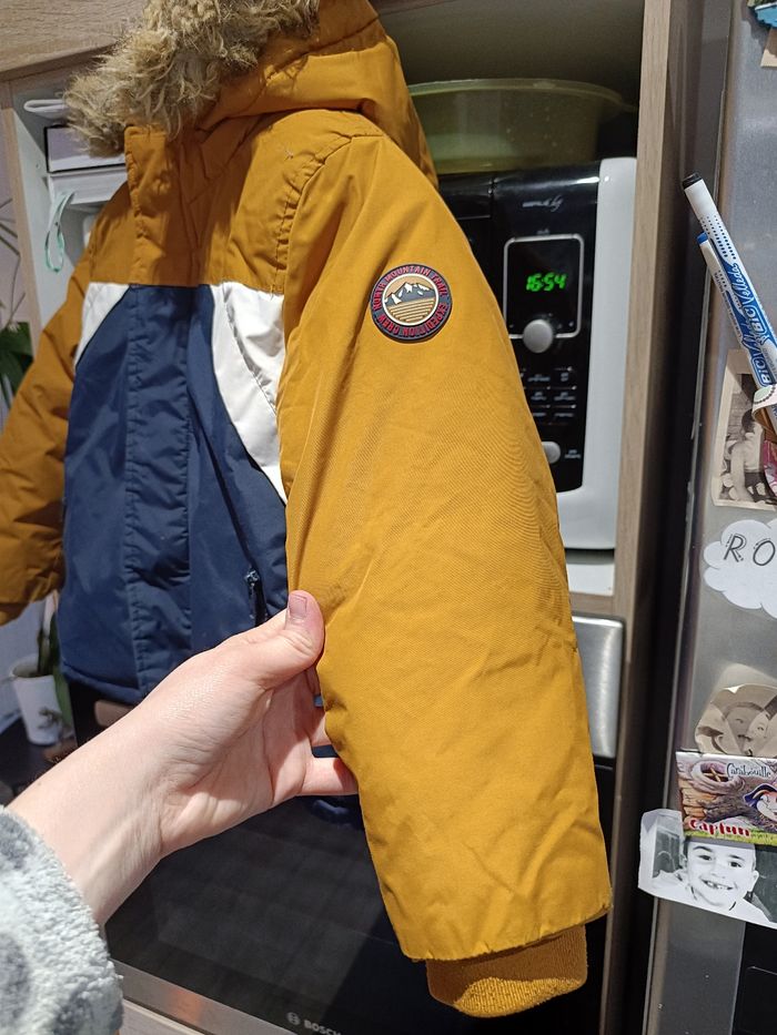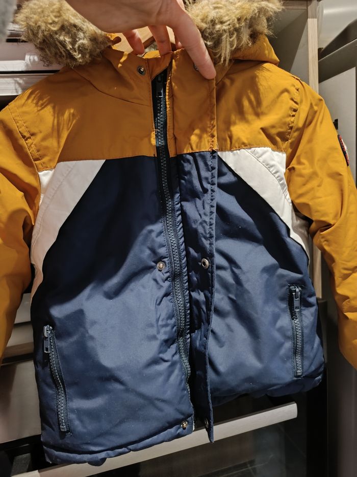Bonjour, Je vends ce manteau de taille 5 ans de marque tape à l'oeil couleur moutarde bleu marine et blanc. La moumoute sur la capuche est amovible. Il se ferme par une fermeture éclair mais vous avez aussi des boutons. Sur le devant il a deux poches qui se ferment avec fermeture éclair il ne présente pas de poche à l'intérieur. L'intérieur est en moumoute ce qui fait que c'est un manteau qui tient bien chaud. Il est trop petit pour mon garçon sinon il aurait encore servi. Envoie rapide et soigné maison non-fumeur et sans animaux. Pas d'offres Merci J'ai surtout utiliser cette application pour acheter que vendre