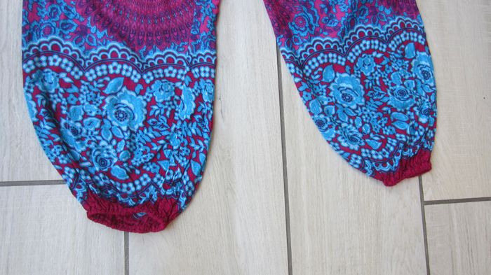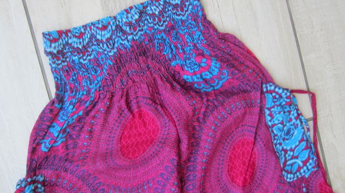 Pantalon détente multicolore. Poches sur les cotés. Entierement smocké a la taille. Bas resserré. Taille 7 ans.