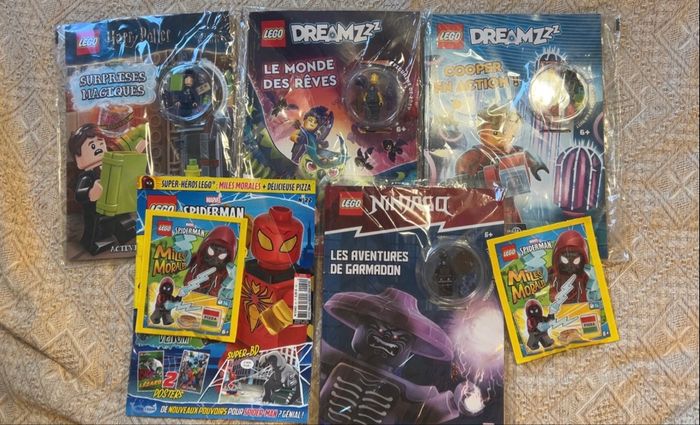 Lot de 5 magazines Lego + 6 figurines Les magazines sont neuf mais abîmé, les figurines sont en état neuf Harry Potter, Dreamzzz, Spiderman, Ninjago