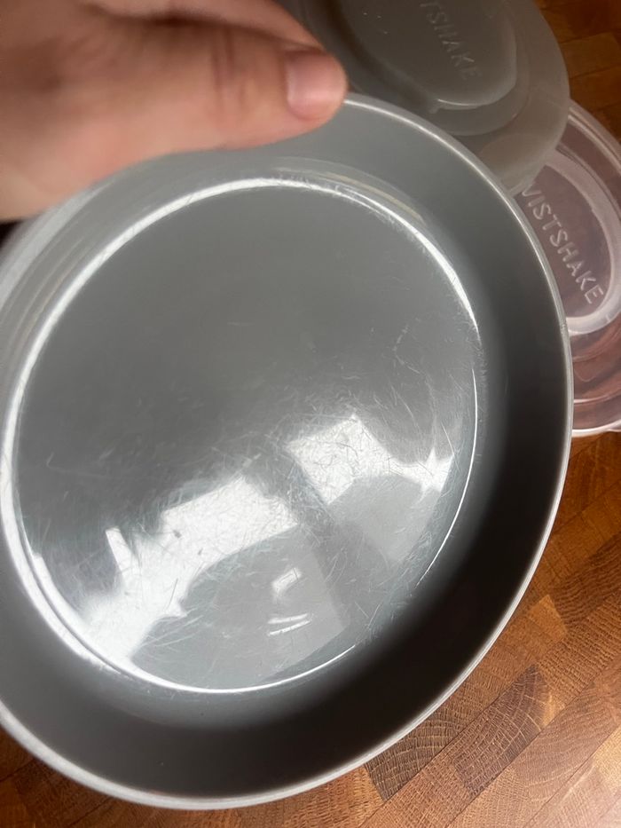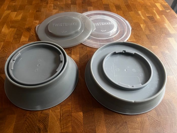 Lot composé d’un bol, d’une assiette, de leur couvercles permettant de les empiler et du plateau antidérapant Twistshake. Le plateau est en parfait état. Le bol et l’assiette sont usées (voir photo), l’assiette n’a été utilisée qu’avec des couverts en plastique. Les couvercles n’ont pas été utilisés.