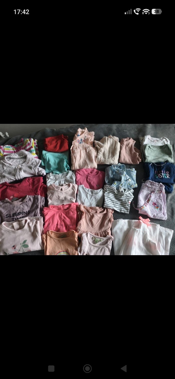 Lot de vêtements d'été 9 mois • 5 pyjamas • 2 bodies manche courte • 1 Bodie avec legging • 10 Tshirts manches courtes • 1 Robe • 1 combinaison manche courte • 2 pyjamas combi short • 1 gilet manche courte • 1 Boléro • 1 pantalon léger Kiabi, brioche, LH, obaibi...