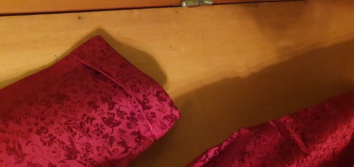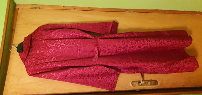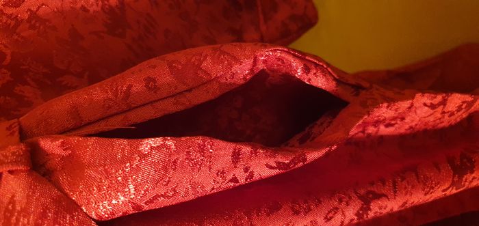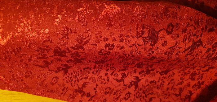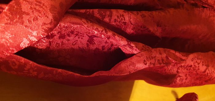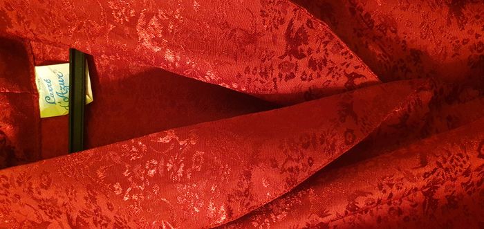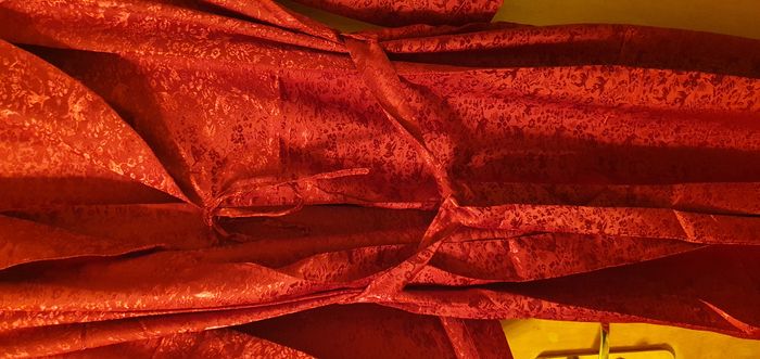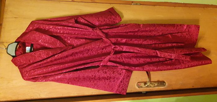 Superbe peignoir rouge passion de chez Carré d'Azur, taille 50/52, 100% polyester, effet satiné et moiré avec des dessins brillants, manches longues à revers de 58cms, col châle fermeture croisée par système de liens intérieurs à nouer et d'une ceinture (3,5cms de hauteur) sous passants sur l'extérieur ce qui permet d'adapter la fermeture du peignoir à la morphologie. Longueur 130cms, neuf jamais utilisé.