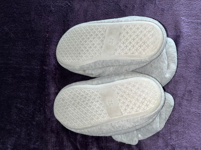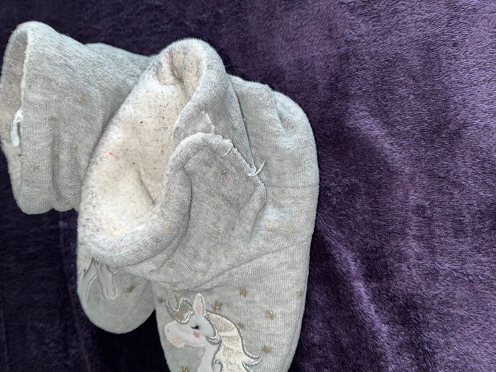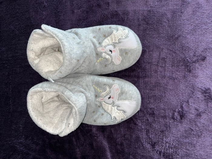 Paire de chaussons grise avec une licorne comme motif, en poiture 32. En bon état.
