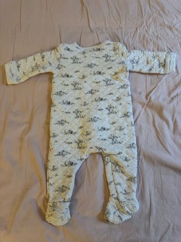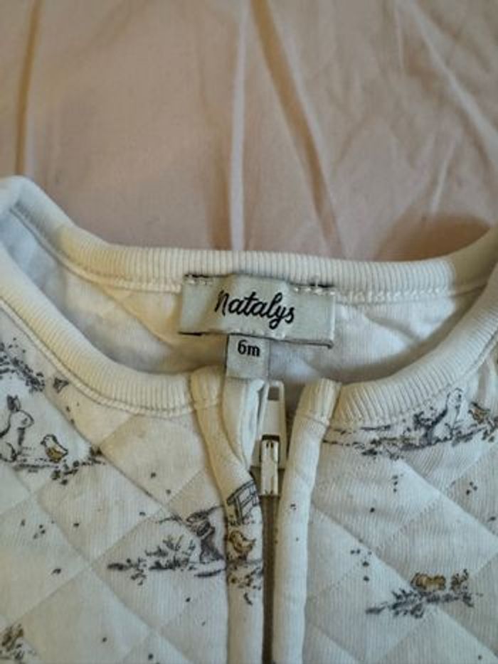 Je vends une magnifique combinaison Natalys, taille 6 mois, idéale pour garder bébé bien au chaud * Marque : Natalys * Taille : 6 mois * Matière matelassée, douce et confortable * Motif délicat esprit toile de Jouy (petits animaux et nature) * Fermeture zippée pratique sur le devant * Pieds intégrés Parfaite pour la mi-saison ou l'hiver, à porter en sortie ou en poussette. Qualité haut de gamme, finitions soignées, comme toujours chez Natalys. V Très bon état V Pas de taches ni accrocs Prix boutique généralement autour de 70-90 €