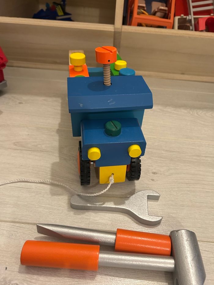 Mon premier Jeu de construction - Camion de bricolage avec ficelle pour le déplacer et 3 outils. En bon état ( 1 acro sur le devant visible sur photos )
