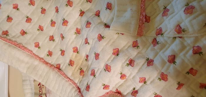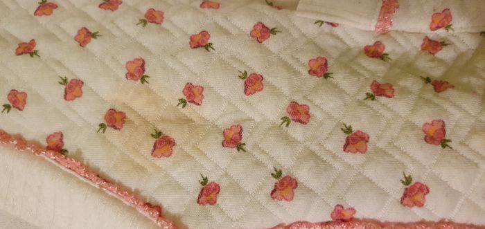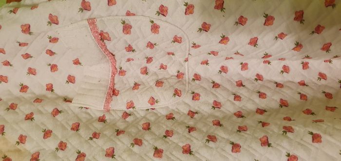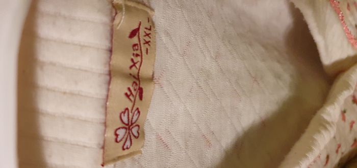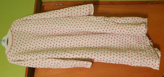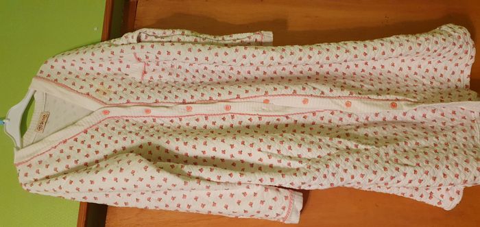 Robe de chambre molletonnée bien chaude et agréable à porter, 100% coton, avec des motifs petites roses sur fond blanc cassé, de la marque Hai Xia, taille XXL , manches longues 49cms avec petit liseré rose, encolure en V et fermeture par boutonnières et 8 petits boutons en forme de fleurs, petite poche à gauche sur la poitrine. Petite auréole au dessus (tentative de repassage) voir la dernière photo. Largeur d'aisselle à aisselle 55cms, largeur hanches 60cms, longueur 102cms.