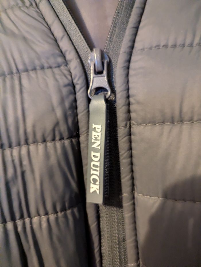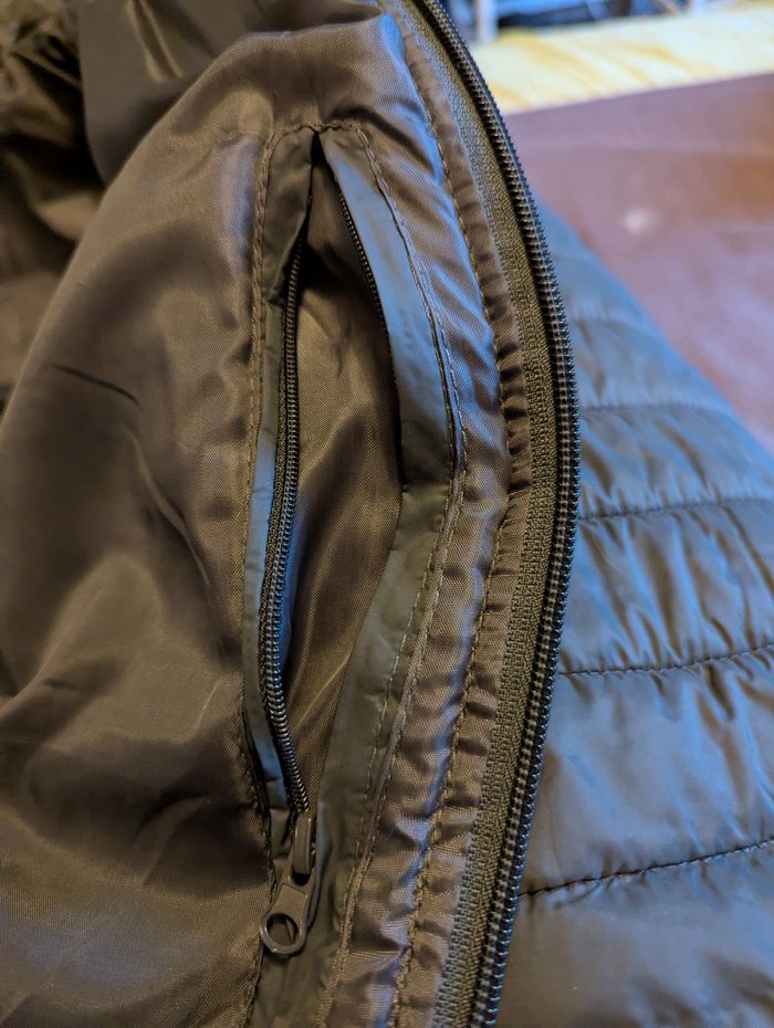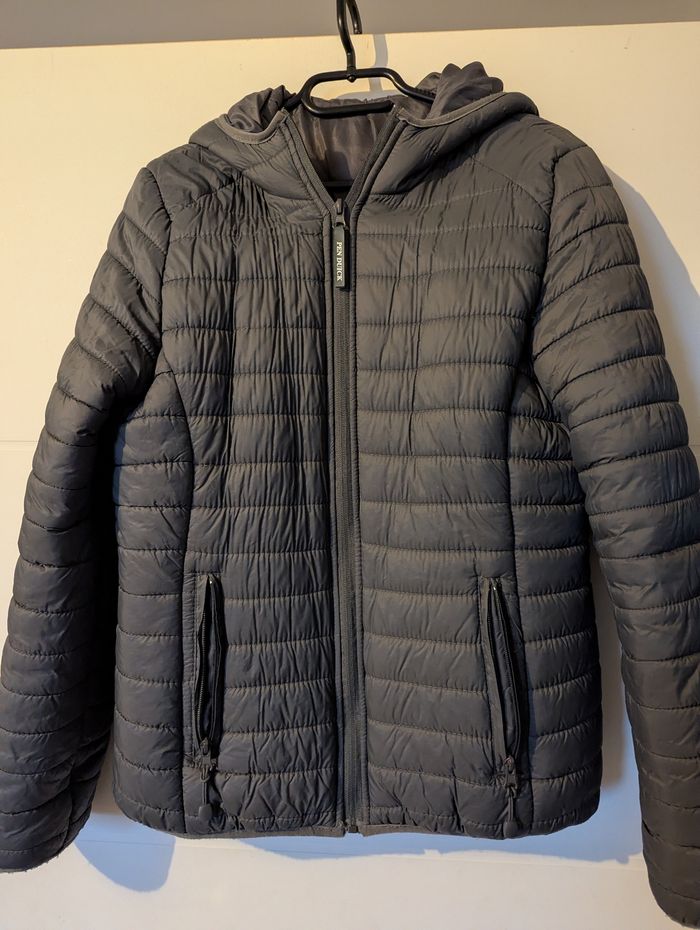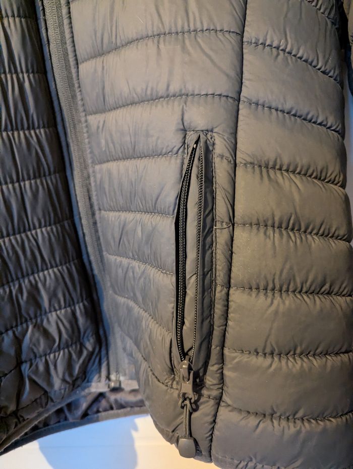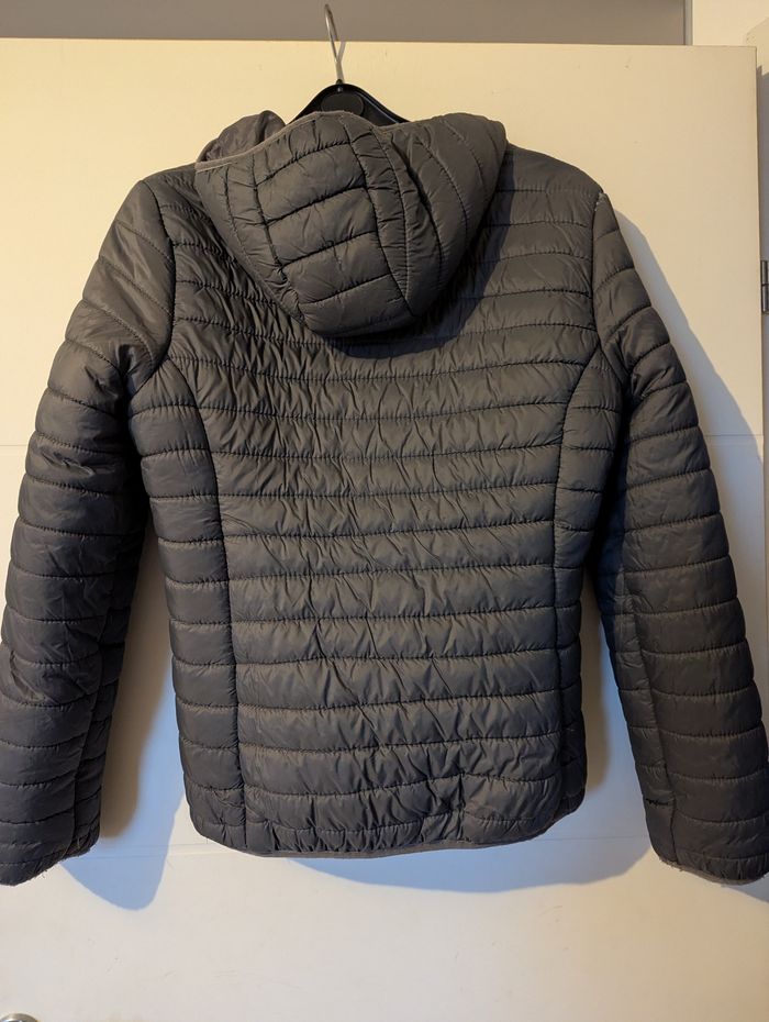 Jolie doudoune fine et chaude kaki avec poches zippées, capuche et 2 poches intérieures. Il n'y a pas d' étiquette mentionnant la taille mais correspond à un 40.
