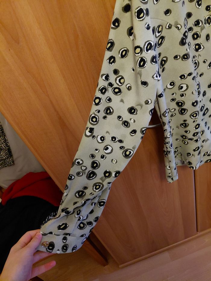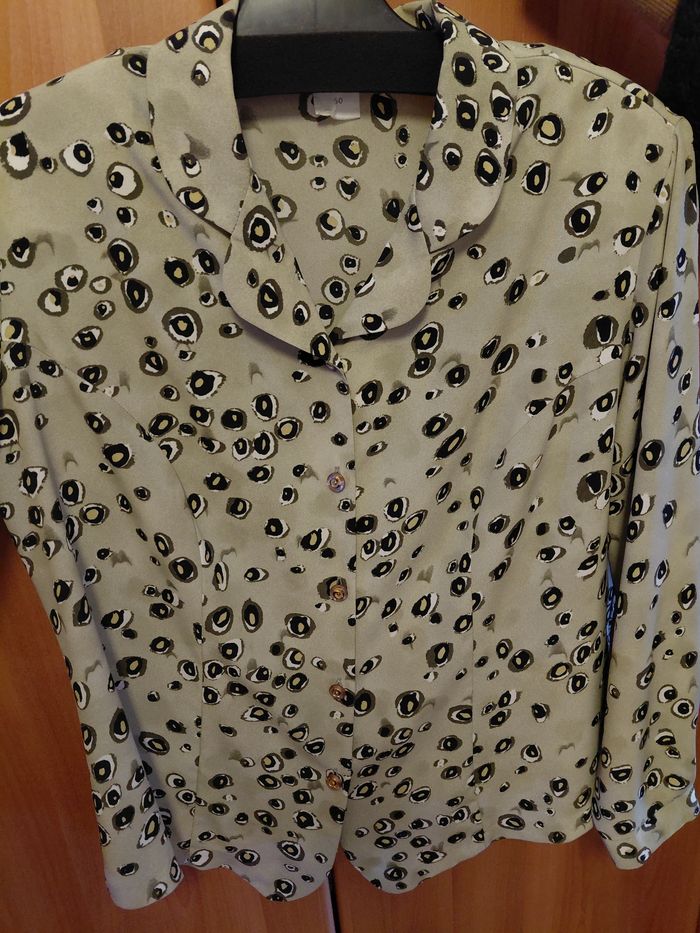 Fine très jolie qui ne se chiffonne pas. Taille 50 Chemisier de qualité, la marque a été effacé sur l'étiquette avec le temps. Prix acheté neuf avec étiquette : 65€