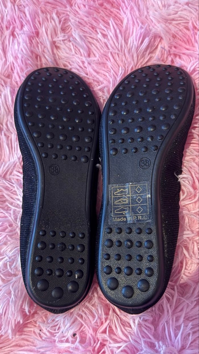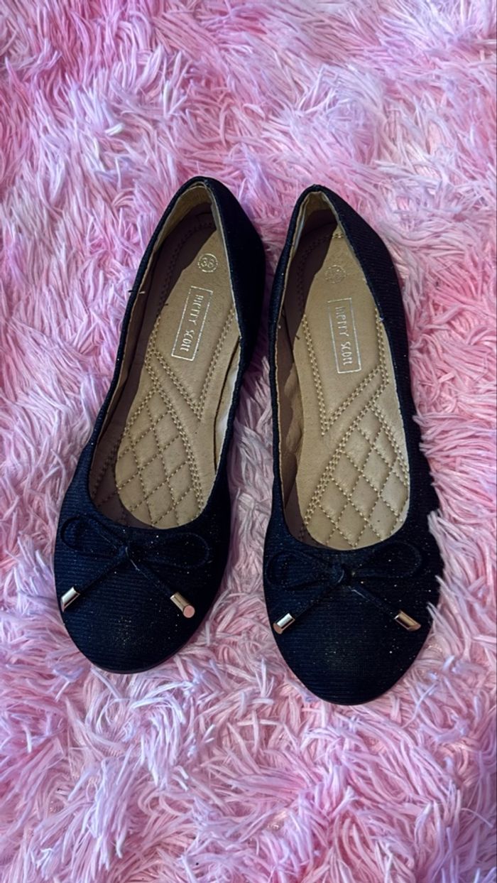 Vends une jolie paire de ballerines de la marque Merry Scott, pointure 38. • État : Neuf • Couleur: Noir avec un effet discrètement pailleté/scintillant qui apporte une touche d'élégance. • Détails : Petit nœud décoratif sur le devant avec embouts dorés. • Confort: Semelle intérieure matelassée avec surpiqûres en losanges pour plus de confort. Semelle extérieure antidérapante à picots. • Style : Idéales pour le quotidien, le travail ou une occasion spéciale. Légères et faciles à porter avec un jean ou une robe