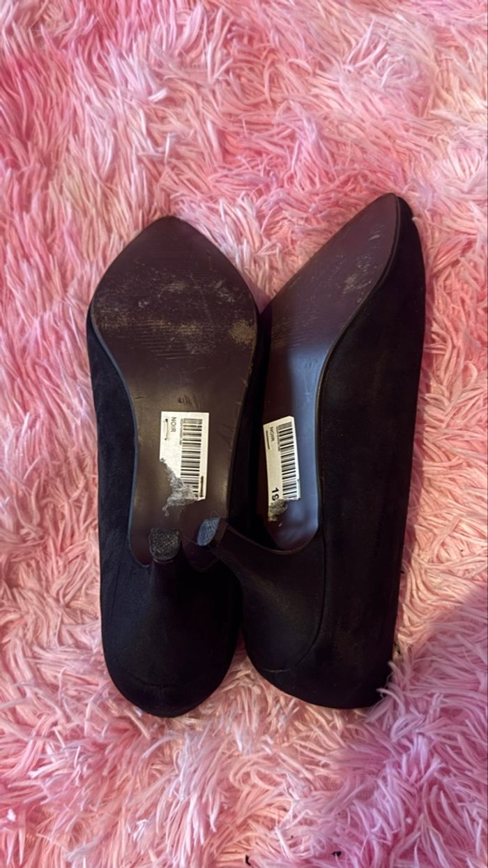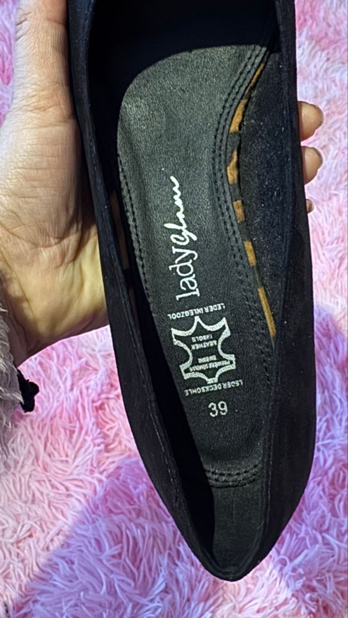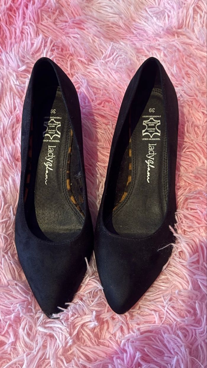 À vendre, une superbe paire d'escarpins noirs de la marque Lady Glam. A Ces chaussures allient élégance et confort grâce à leur semelle intérieure en cuir (mention "Leder Decksohle / Cuir véritable"). Elles sont parfaites pour une soirée, le travail ou une occasion spéciale. • Marque : Lady Glam • Taille : 39 • Couleur: Noir (Noir intense) • Matière : Aspect daim/suédine avec intérieur en cuir. • État: Très bon état • Détails : Petit talon aiguille très stable et bout pointu élégant. Intérieur avec motif léopard discret sur les bords.