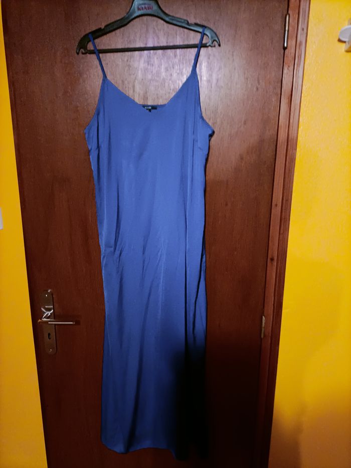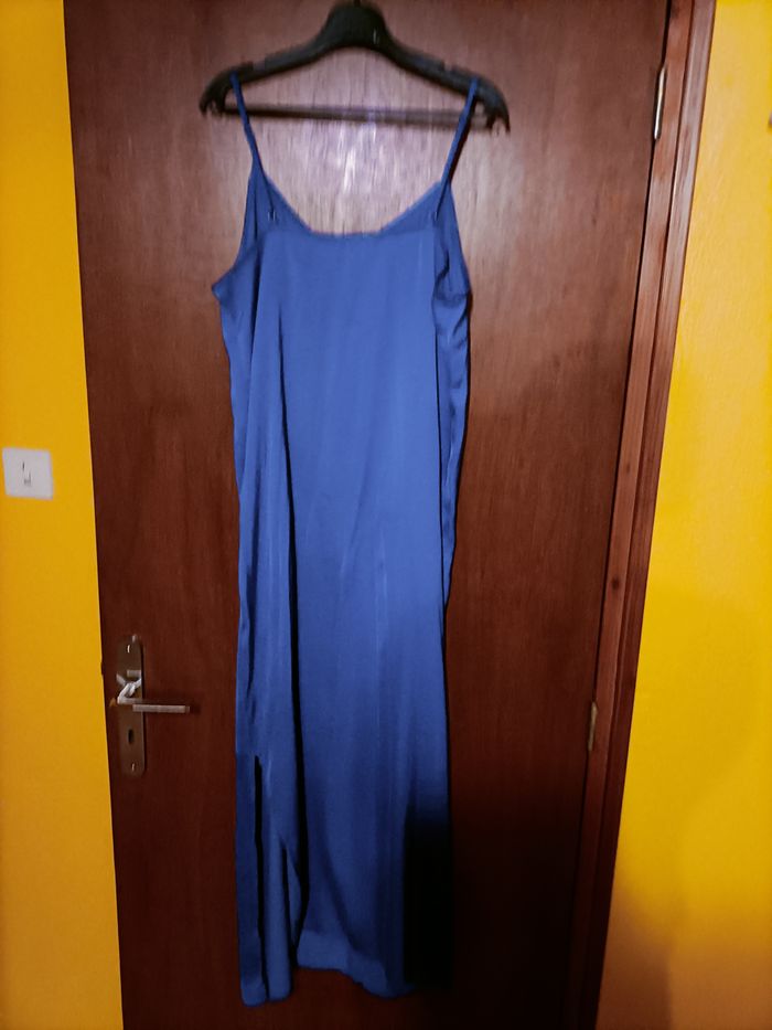 Robe longue bleue à bretelles réglables, mesure environ 133 cm, taille 40.