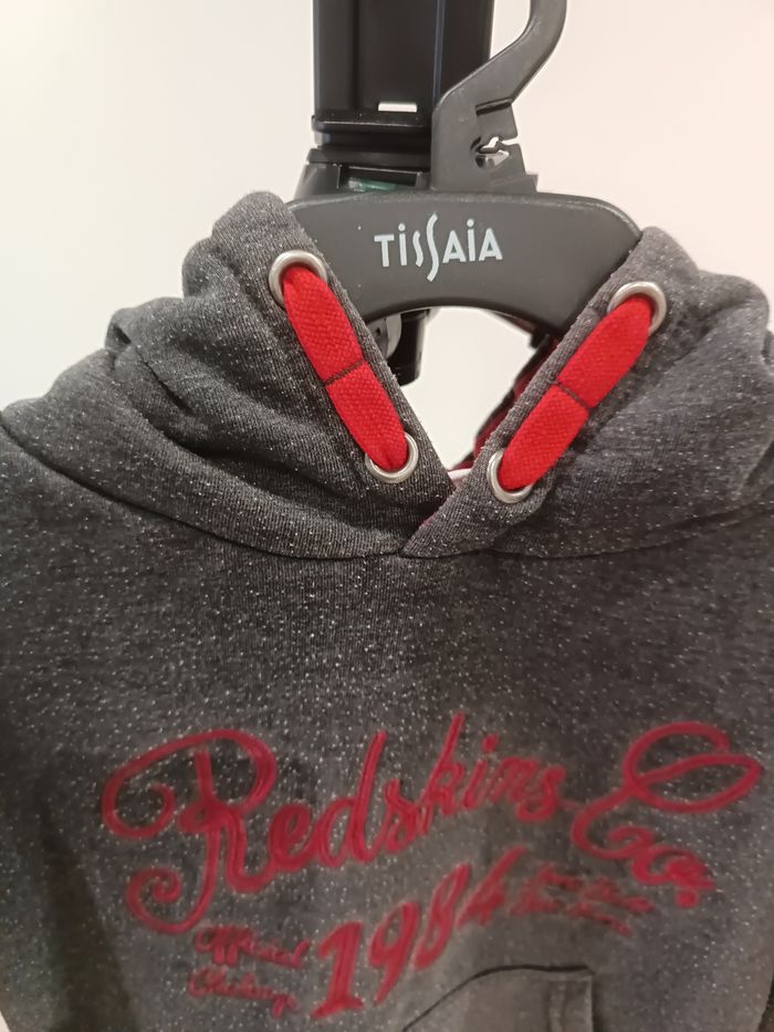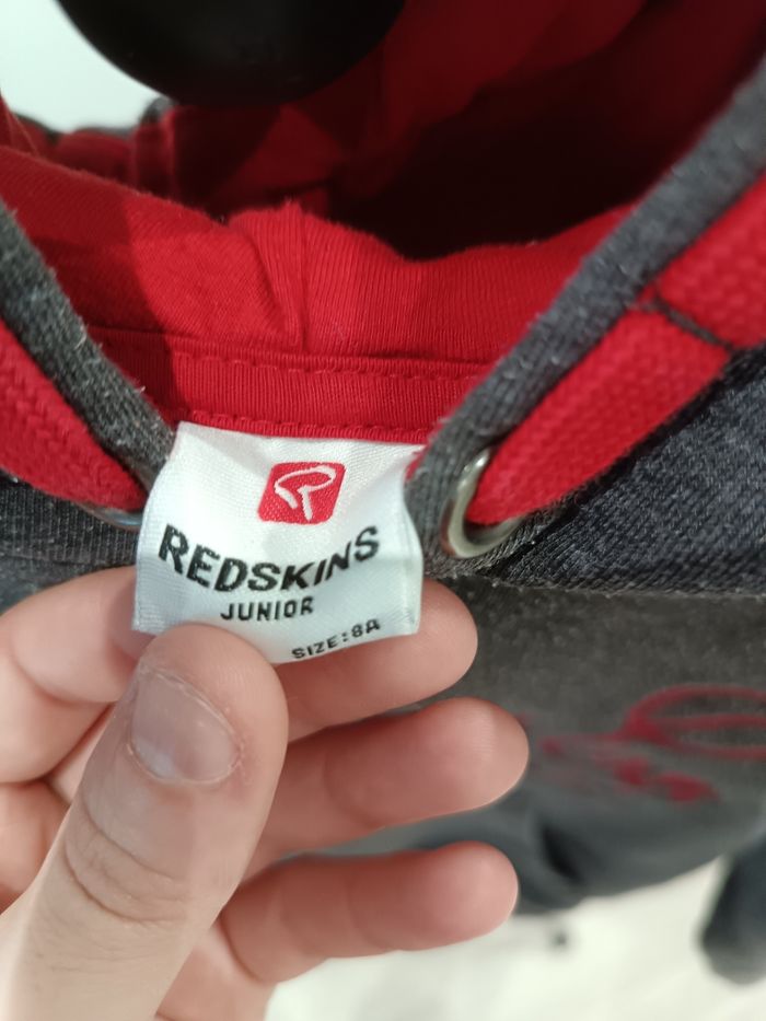 Sweat à capuche Redskins taille 8 ans. Couleur gris foncé avec logo rouge brodé sur le devant. Poche kangourou à l’avant. Intérieur doux et confortable, idéal pour l’école ou les sorties. Bon état général 👍 Pas de trous ni taches.