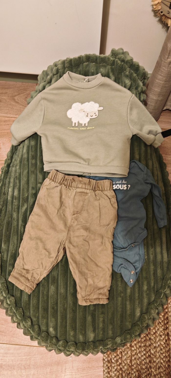 Vends ensemble orchestra et gémo garçon taille 1 mois composer de : ✅ Pull orchestra 1 moi vert avec dessin mouton ✅ Pantalon beige orchestra avec taille elastique ✅ Bodie bleu petrol Gémo ecrit "qui veut des bisous" Ensemble en parfait etat très peu porter Laver avec lessive special bebe Maison non fumeur Lot possible n'hésitez pas à me contacter au besoin