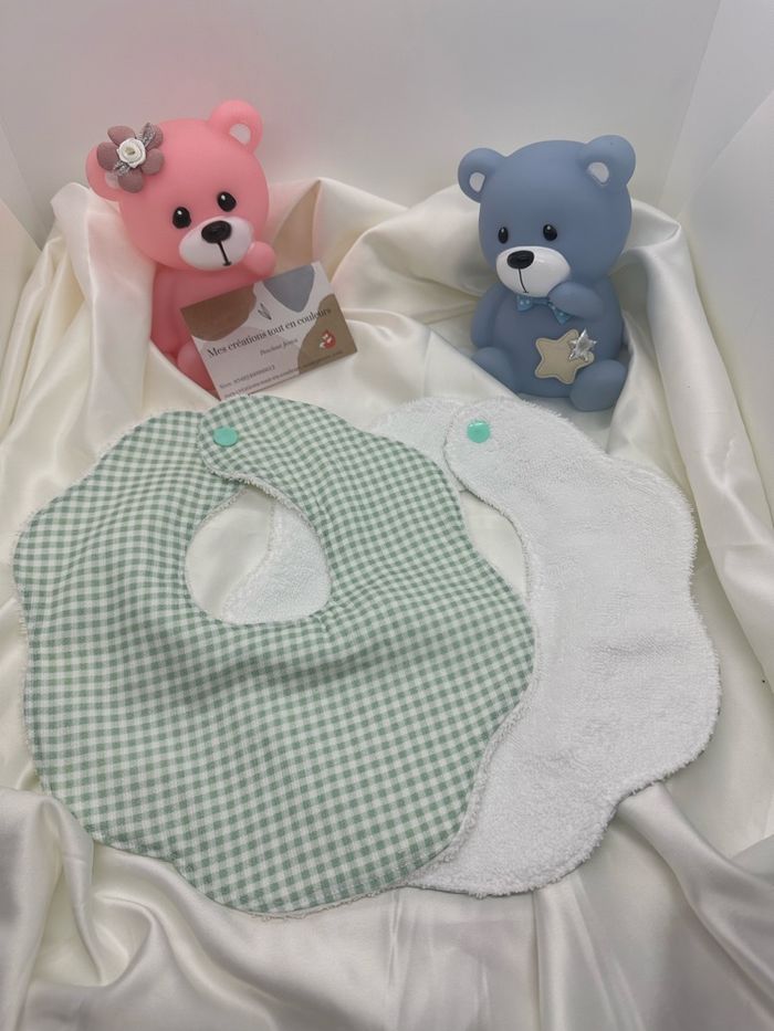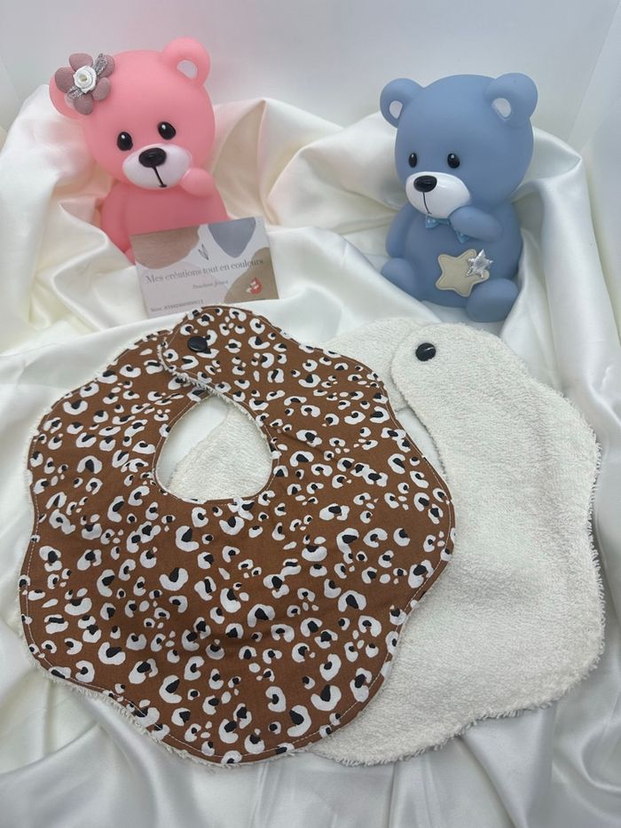 Bavoir fleur en coton à motifs ou non et en éponge , 4,50€ l’unité et le premier lavage à 30 degrés.