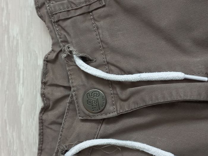 Bermuda en toile à taille réglable avec élastiques à l'intérieur. Défaut à noter : le tissu du trou autour d'un lacet est déchiré (voir photo)