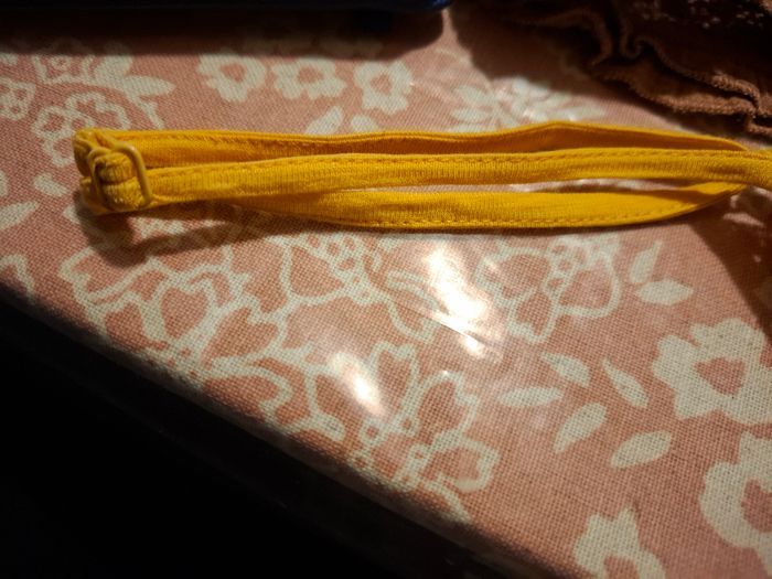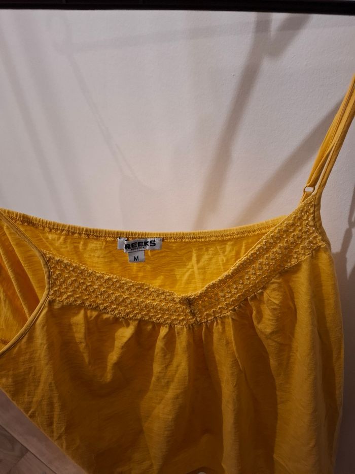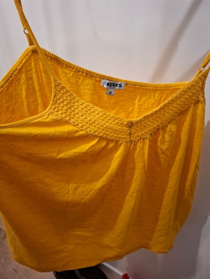 Un debardeur jaune a bretelle reglable se porte ample sur devant de ́ en hauf la poitrine dentelle marqye creeks le deuxieme simple ample aussi les bretelle plus large de la marque yessica