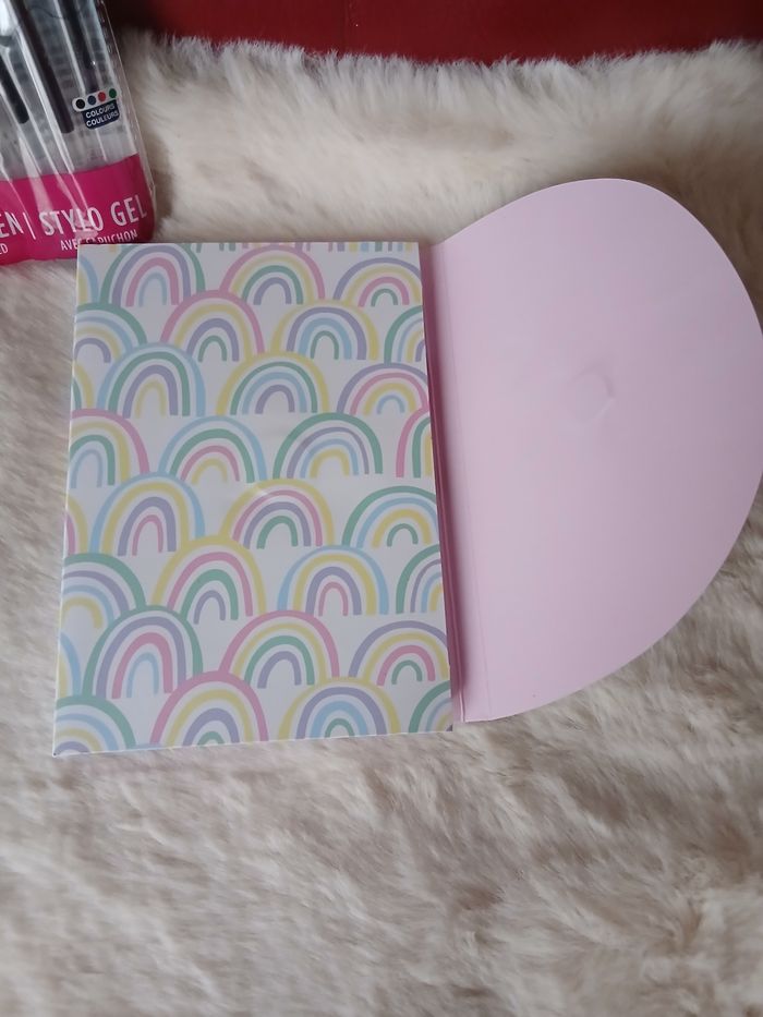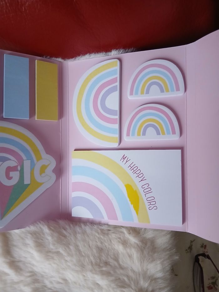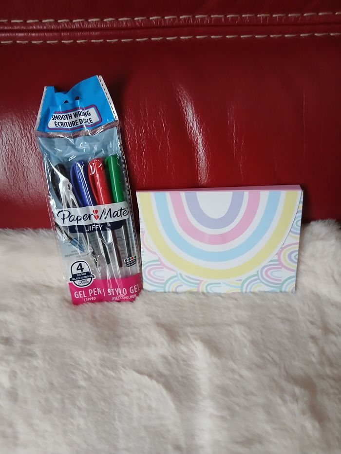 Articles neufs. 1/ Paquet de 4 stylos-gel marque Paper;collection Jiffy; 4 coloris; pointe 0,5 mm. 2/ Carnet aimanté contenant des notes adhésives ( style post-it) fantaisie; multicoloris et multiformes. Plusieurs motifs arc en ciel . Format du carnet 14,8 X 10,5 cm // voir photos pour détails.