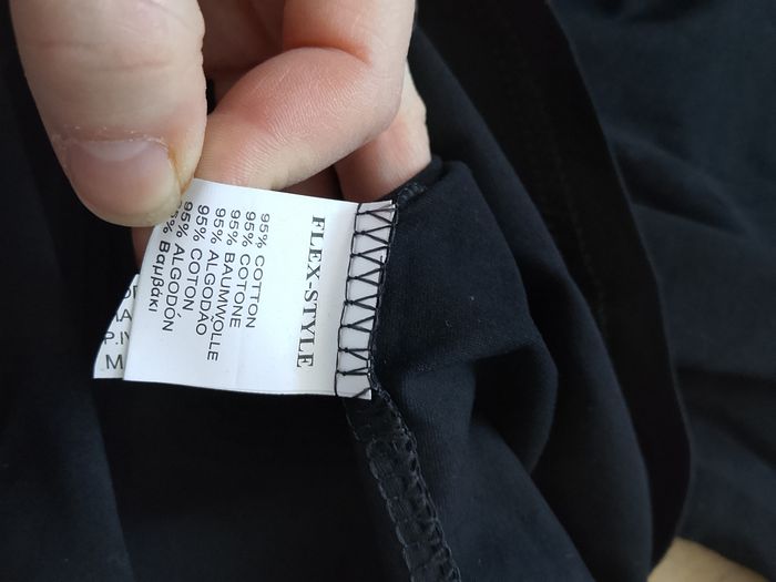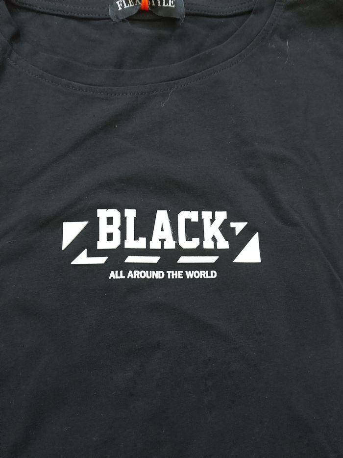 T-shirt noir manches courtes pour homme. Flocage sur le devant en relief, flocage sur le dos. Coupe droite sur le bas. La première photo est le dos. Taille : Étiqueté en XL Marque : Flex Style Mesure dessous de bras à dessous de bras : 53 cm Article neuf avec étiquette. Vendu en magasin au prix de 24,99€. 2610 noir XL N°1