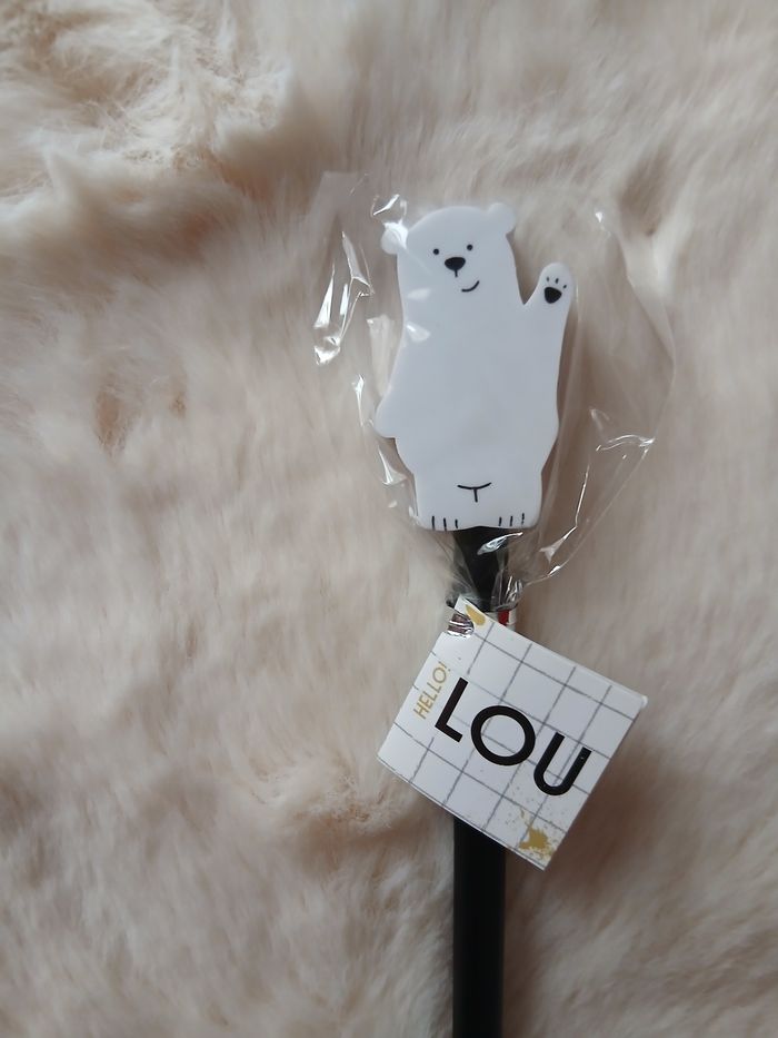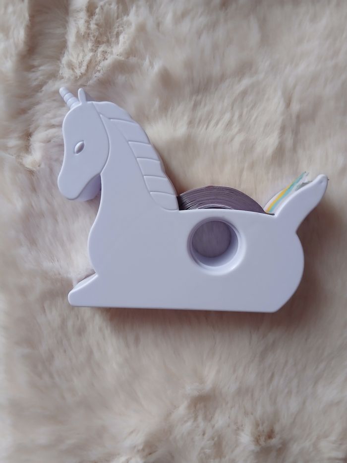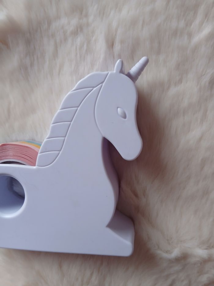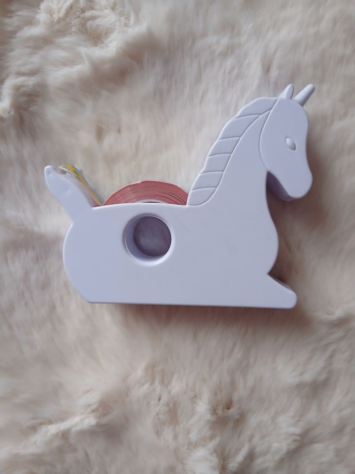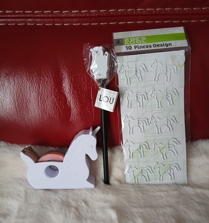 Articles neufs. 1/ Dévidoir de Scotch en forme de Licorne. Rouleau de Scotch aux couleurs de l'arc en ciel; dévidoir en plastique 2/ Paquet de trombones en forme de Cheval 3/ Crayon fantaisie Ourson polaire; marque Lou // voir photos pour détails