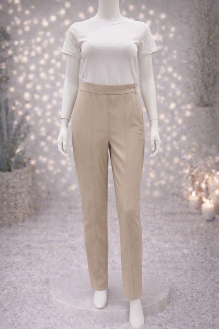 Pantalon femme effet similicuir (aspect légèrement brillant / plastique), couleur beige. Marque Amisu. Taille 38. Coupe droite avec taille haute, coutures apparentes sur le devant pour un effet structuré et tendance. Fermeture discrète sur le côté. Idéal pour un look chic, soirée, sortie ou tenue habillée avec un blazer ou un top ajusté 🤍 Très bon état