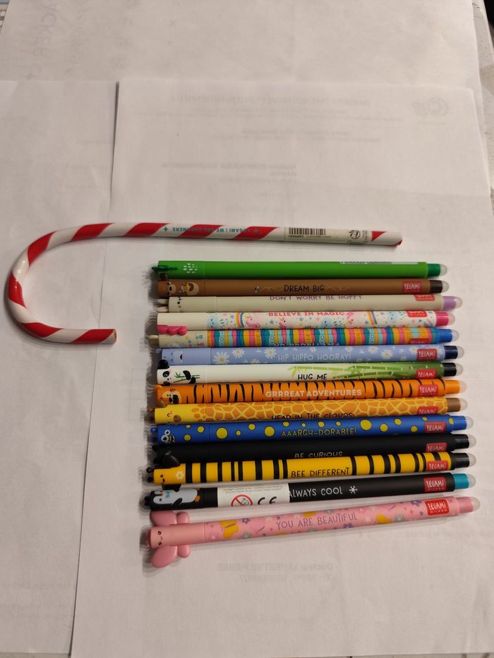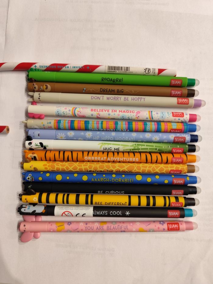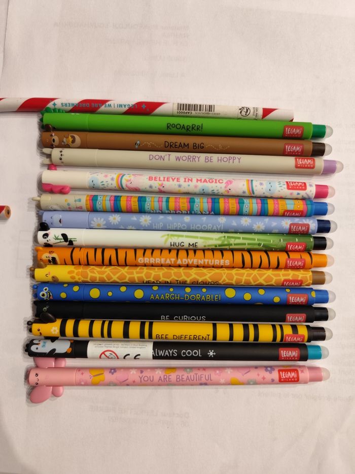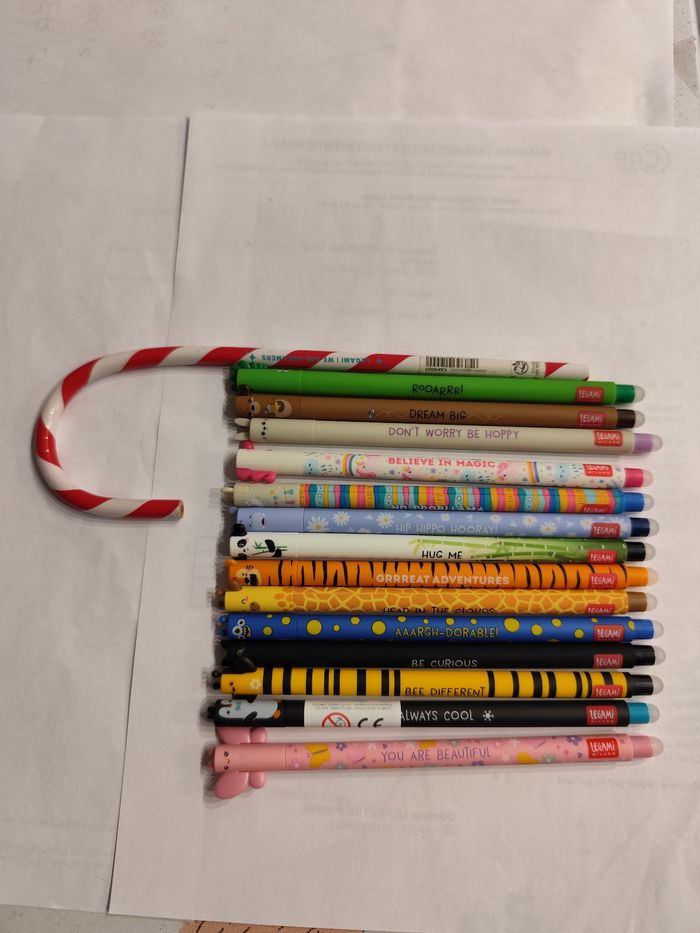 Je vends un lot de 14 stylos legami effaçable et un crayon sucre d'orge offert. Prix 25€ Neuf jamais utilisé