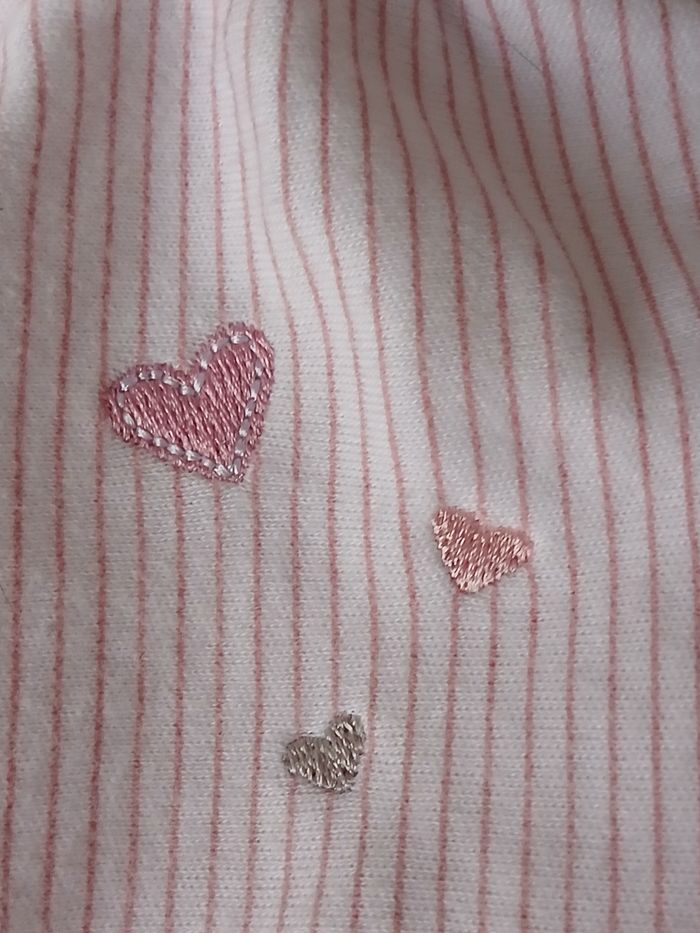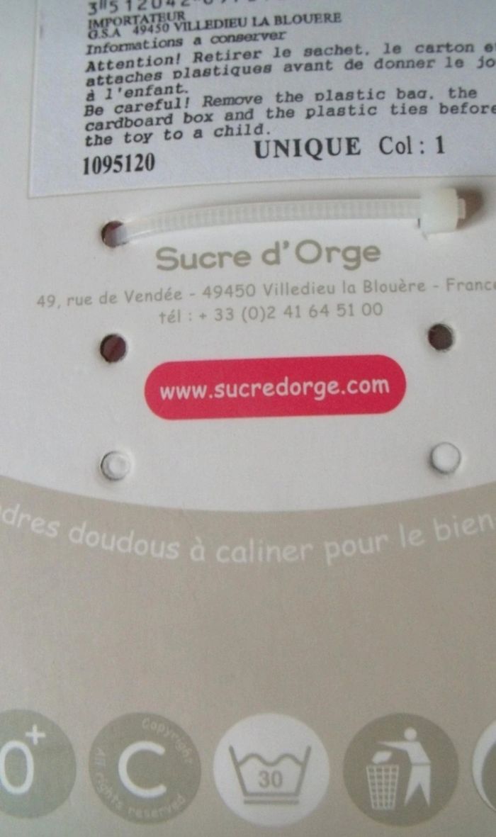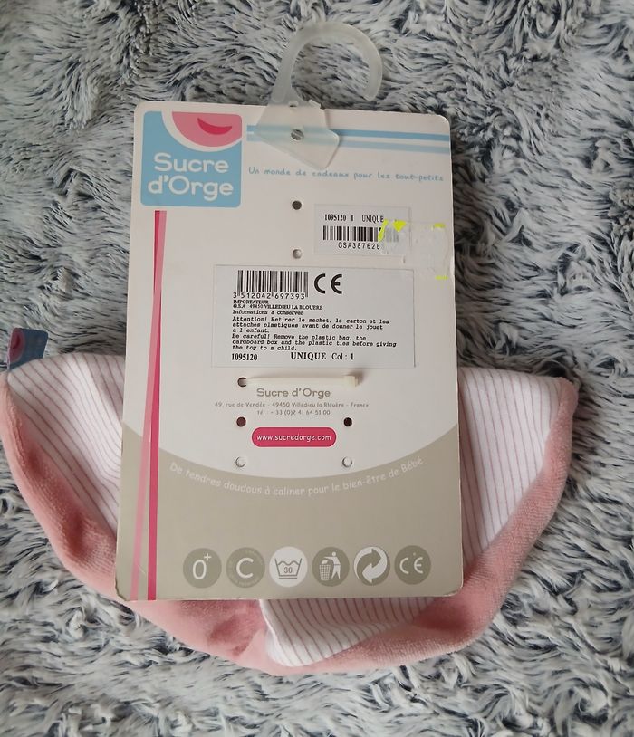 Article neuf, encore étiqueté. Poupée-Doudou marque Sucre d'orge.Tête poupée rembourrée; en tissu éponge. Corps plat et circulaire coloris crème avec rayures roses dessus; dos uni. Motifs "petits coeurs brodés devant. Hauteur du doudou plié = 15,5 cm. Lavable à 30° // voir photos pour détails . A NOTER : trace étiquette prix au dos du carton de présentation