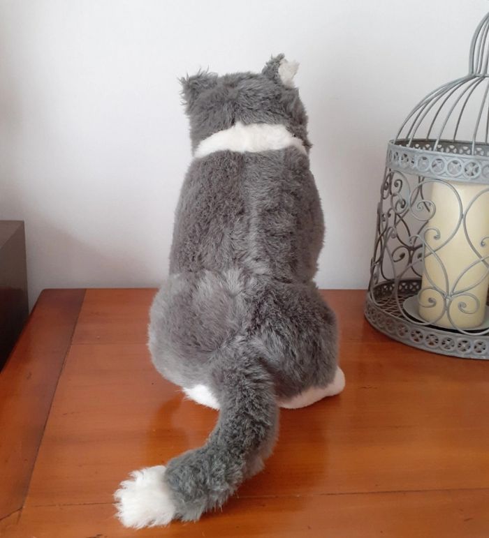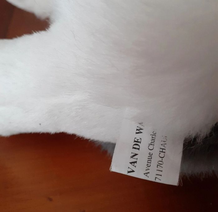 Peluche entièrement rembourrée; marque Van De Walle; yeux boutons et paupières en plastique; museau en plastique. Bicolore; armatures à l'intérieur des pattes avant pour faciliter la position assise. Hauteur totale de 31 cm // voir photos pour détails