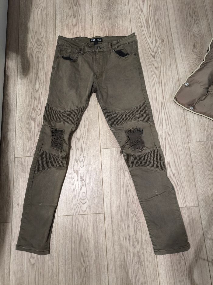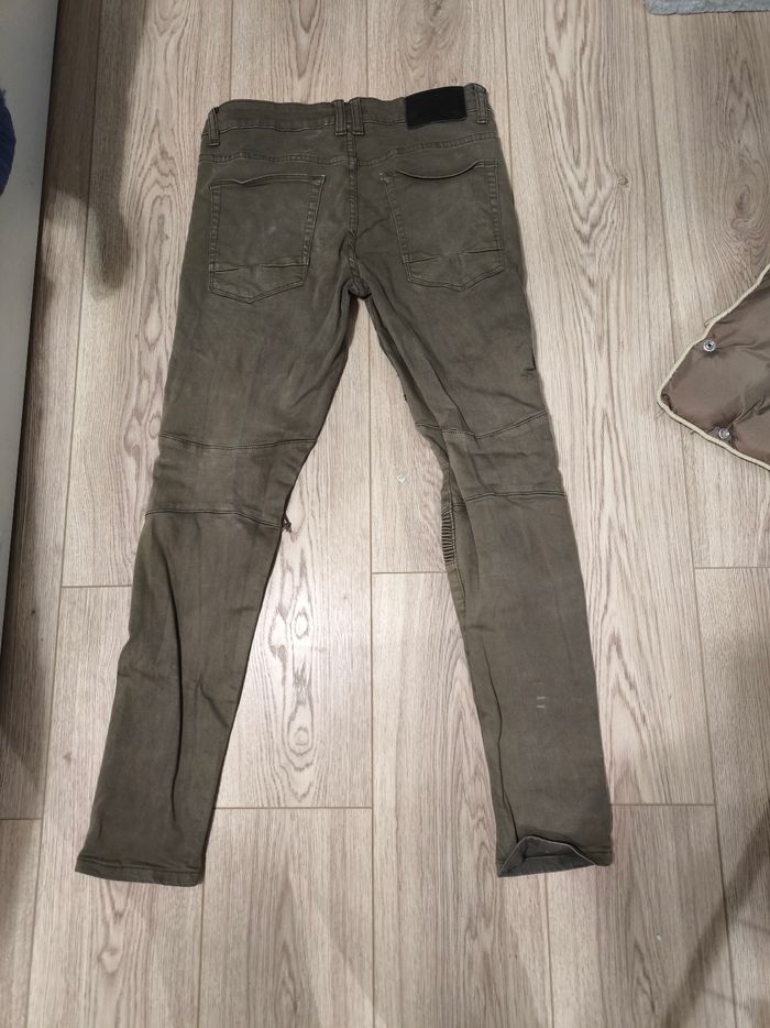 Jeans couleur kaki, taille 32/32, taille petit malgré tout. Avec empiècements côtelés et détails déchirés au niveau des genoux. Quelques traces d'usure mais reste en bon état général.
