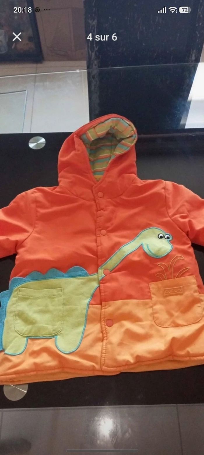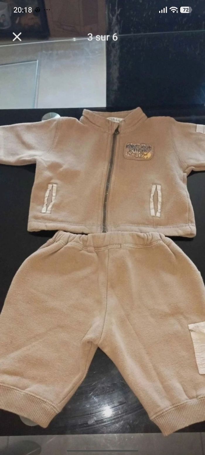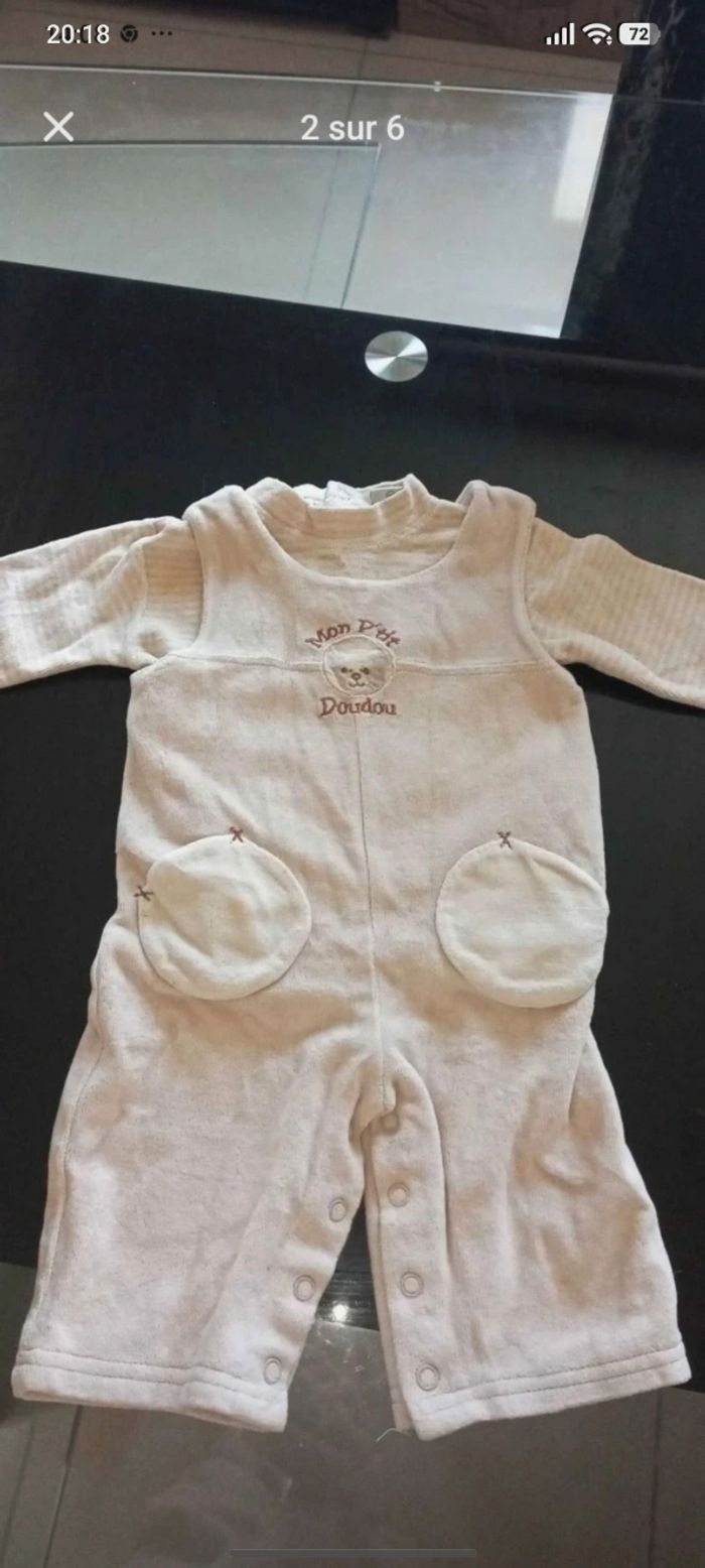 Vends un joli lot de vêtements pour petit garçon en taille 3 mois, en très bon état. Parfait pour constituer ou compléter la garde-robe de bébé avec des pièces variées et colorées ! 📦 Le lot comprend : 1 Manteau à capuche orange avec un adorable motif dinosaure 🦕. 1 Ensemble beige composé d'un gilet zippé et d'un pantalon assorti. 1 Pyjama (grenouillère) rouge et blanc à rayures avec pieds intégrés. 1 Salopette/Dors-bien en velours beige tout doux "Mon P'tit Doudou". 2 Bodies à manches longues (type cache-cœur, très pratiques pour l'habillage). 1 Paire de chaussettes hautes assorties bleues et blanches. ✨ Détails : Taille : 3 mois État : Très bon état, soigneusement lavés. Style : Confortable et mignon. Maison non-fumeur. Envoi rapide et soigné via le transporteur de votre choix.