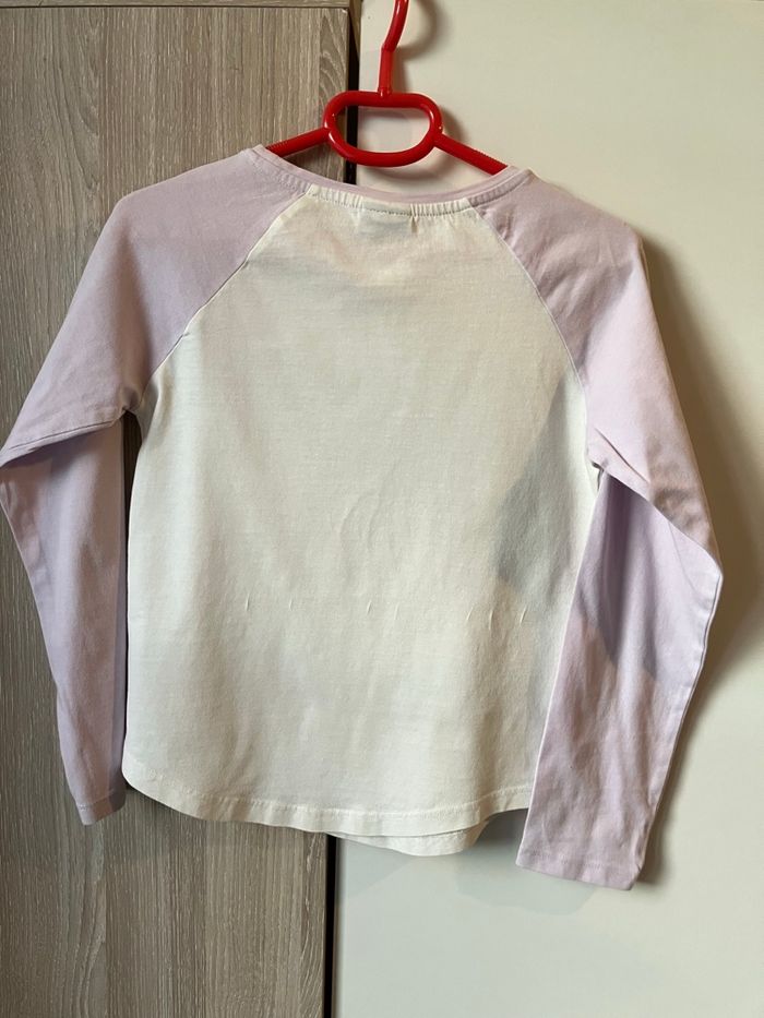 Haut manches longues fille 8 ans. Couleur blanc et violet. Inscription brillante En très bon etat. Pas de trou ni de tache. Marque : tape à l’œil