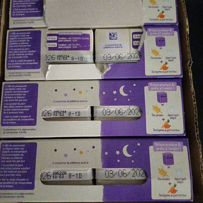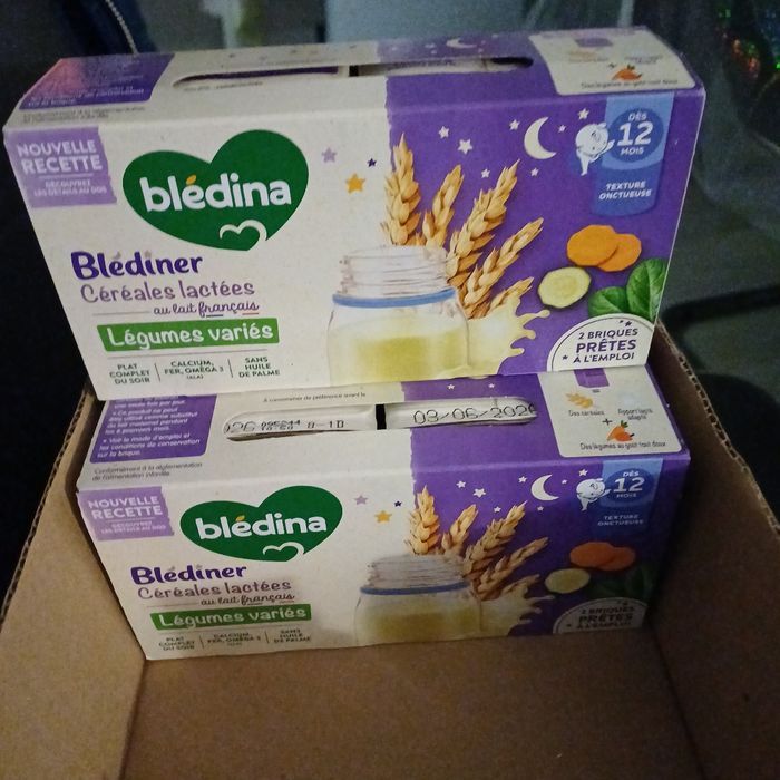 Bonjour, je vends ces 6 lots de blediner carottes petits pois dès 12 mois date de péremption 4 juin 2026 et ces 5 lots légumes variés dates de péremption 3 juin 2026 et ces 6 briques de potiron date de péremption 7 mai 2026