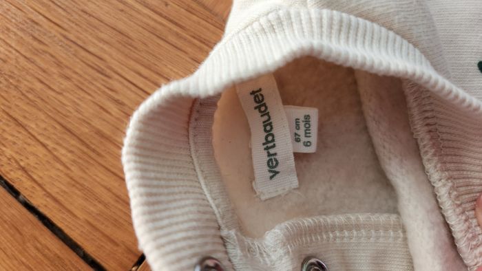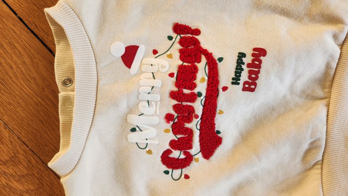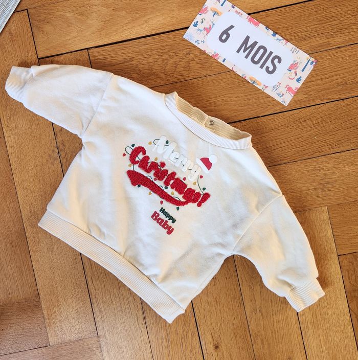 Sweat de Noël pour bébé en taille 6 mois Marque Vertbaudet Issu de la collection capsule Famille - Inscription Merry Christmas, Happy Baby Porté une fois Maison non fumeur et sans animaux.