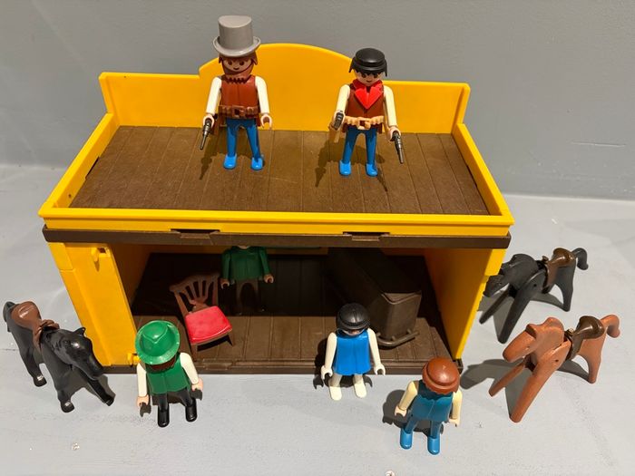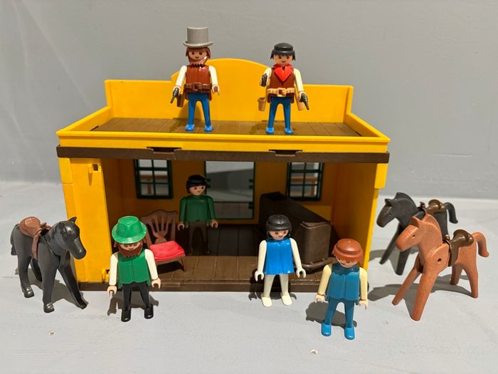 Playmobil Saloon Western Cowboys indien Saloon très bon état de face mais pièces manquantes à l’arrière ( doubles portes, charnières droite, portes battantes) 6 personnages 3 chevaux Bar et chaise 9 accessoires