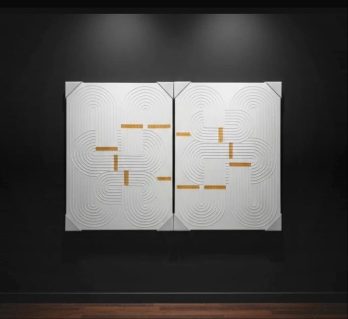 ensemble de deux tableaux (diptyque) au style contemporain. • Motifs en relief (lignes courbes) avec touches dorées. • Blanc immaculé et or, cadre assorti avec coins de protection. • Neuf l’un encore sous blister . • Idéal pour une déco chic, scandinave ou moderne. • 📏 taille : 50x70 cms