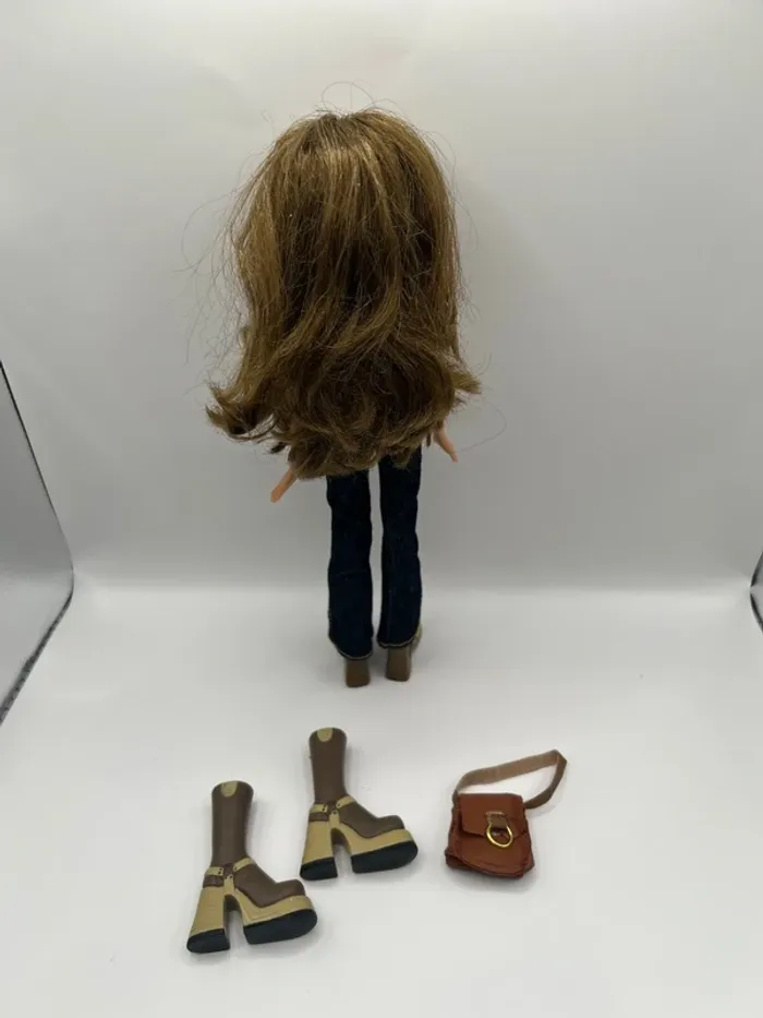 Poupée Bratz Yasmin – Xpress It! (2002) par MGA Entertainment. Vendue avec les éléments visibles sur les photos : tenue, sac, et deux paires de chaussures.