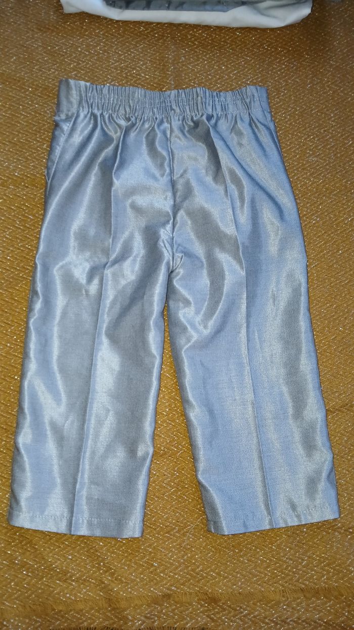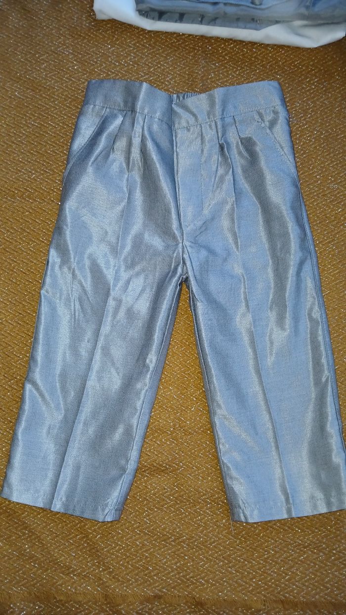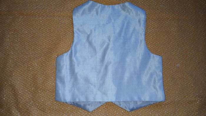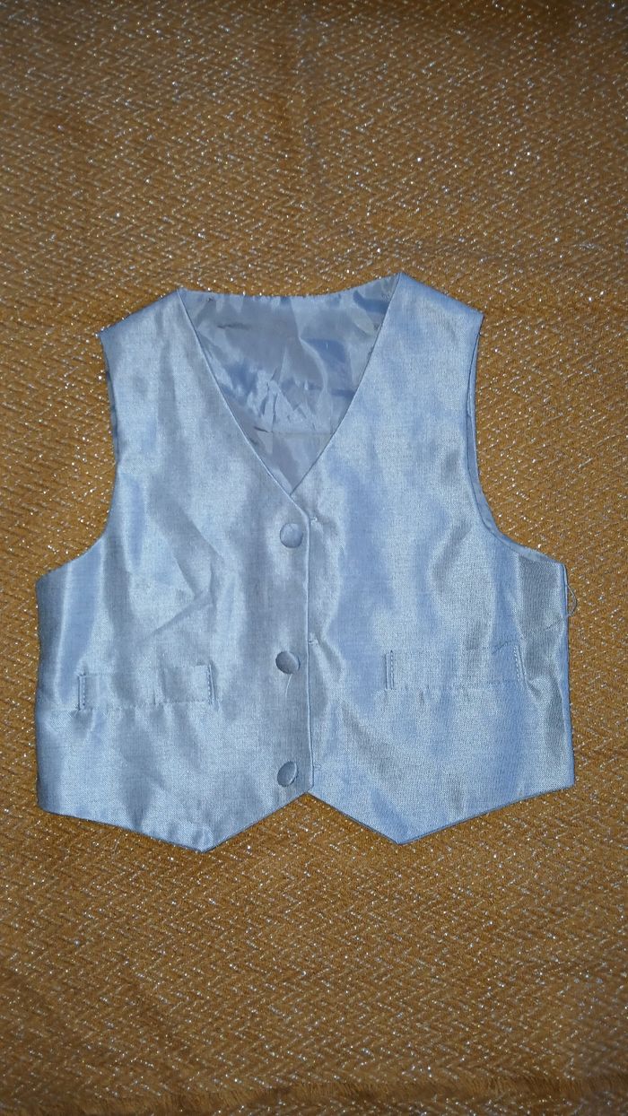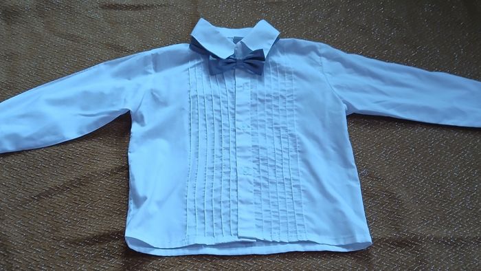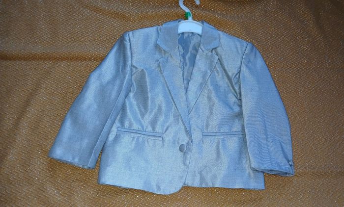Costume 5 pièces 1 chemise manches longues blanches 1 boléro 1 pantalon 1 nœuds papillon 1 veste de caustume (petit défaut sur une manches de la veste voir photo deja présente lors de mon achat) Porter 1 seul fois lors d'une cérémonie Taille 24 mois Acheter chez kysly