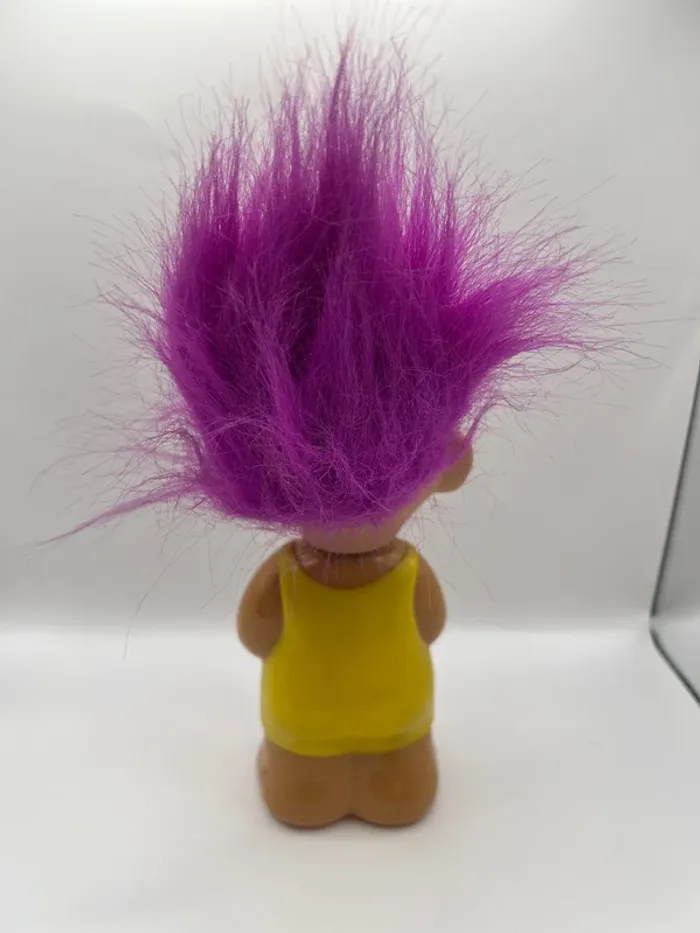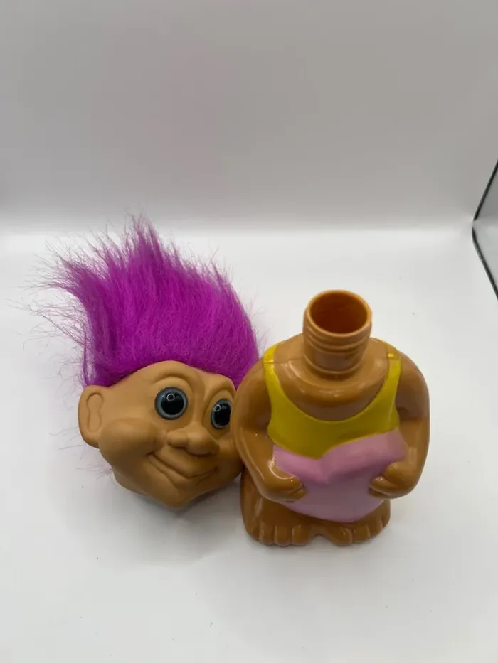 Troll bouteille vintage avec cheveux roses vifs. Joli objet déco rétro / années 90. Couleurs encore belles, cheveux bien fournis.
