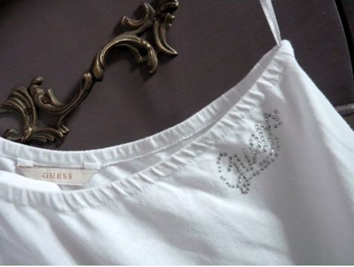 """"" GUESS """" Taille 6 ans Débardeur fille TBE Asymétrie soulignée d'un voile volanté 100 % coton Guess en strass ( aucun ne manque !) Longueur : 45 cm envoi ok