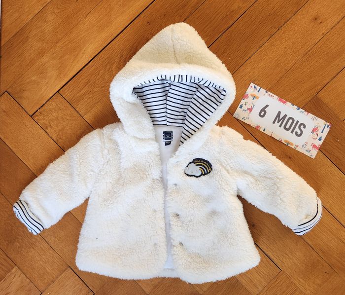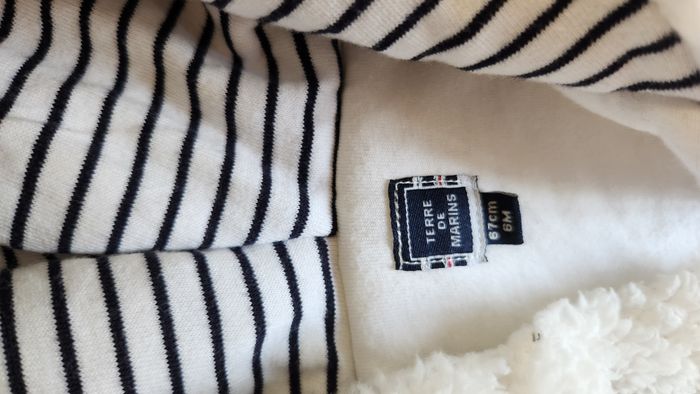 Manteau veste gilet effet fourrure blanche avec doublure marinière pour bébé en taille 6 mois Marque Terre de Marins Maison non fumeur et sans animaux.