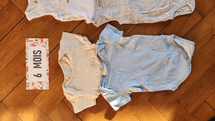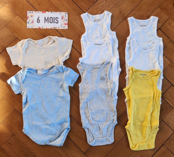Lot de 8 body à manches courtes ou marcel pour bébé en taille 6 mois Essentiellement de marque Orchestra Maison non fumeur et sans animaux.