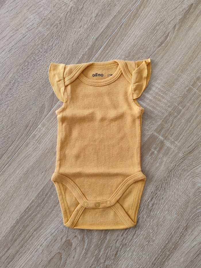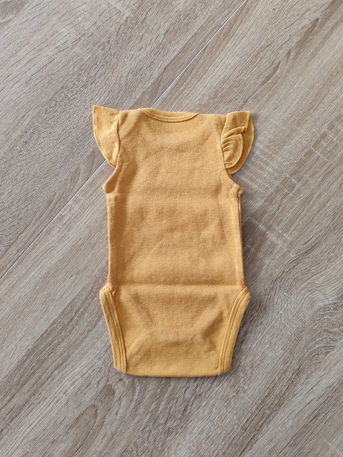 Lot de 2 bodys manches bretelles, - moutarde à manches volantes, - blanc à bretelles. Gémo, taille 1 mois, très bon état.