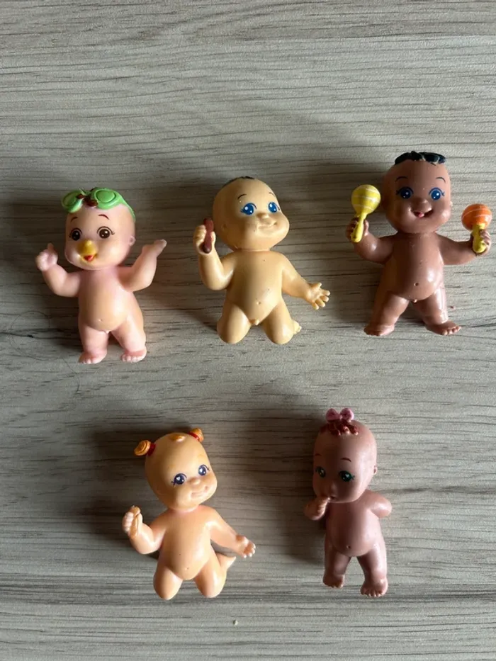 Lot de figurines Babies Paciocchini vintage, années 90. Le lot comprend 5 bébés avec différentes poses et expressions, certains avec accessoires moulés.