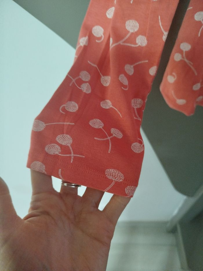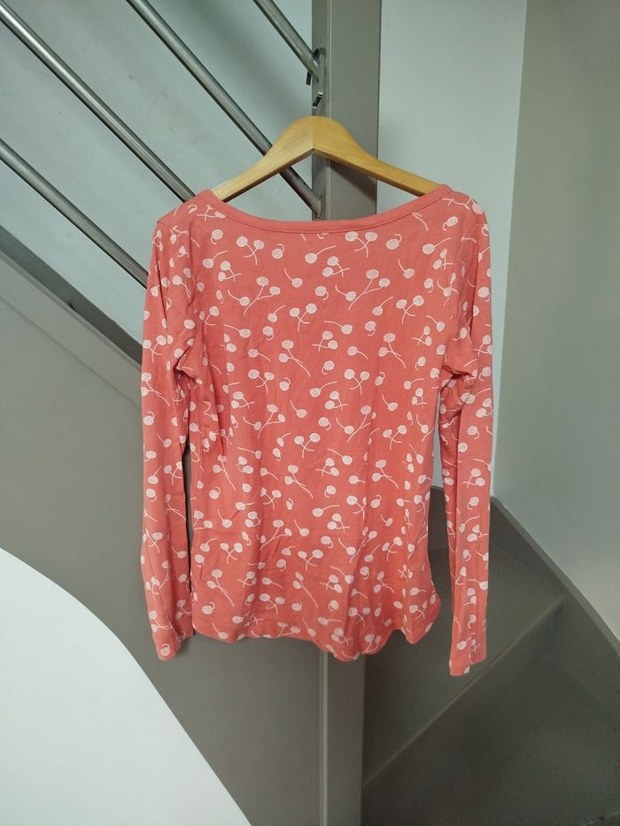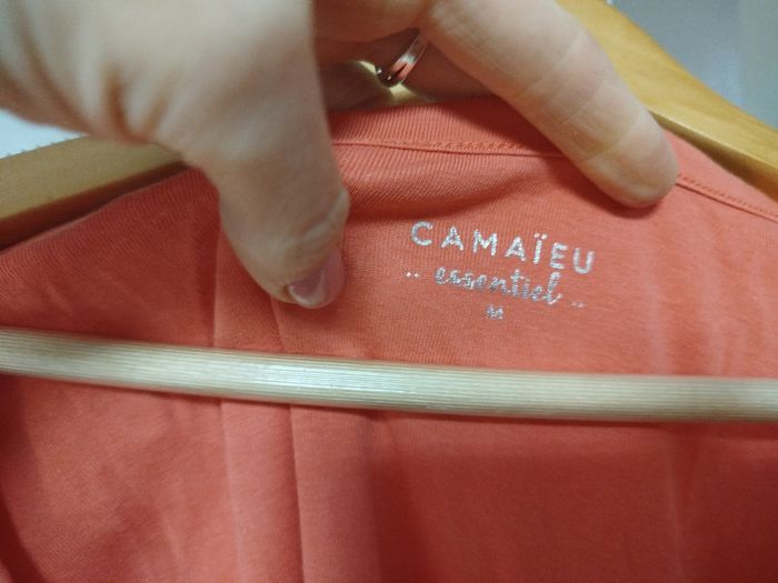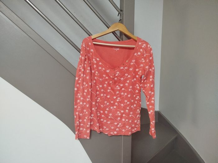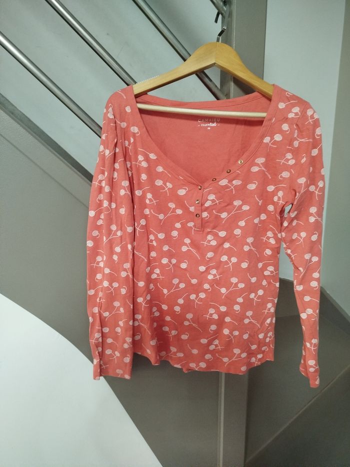 Tee-shirt manches 3/4 et col V. Boutons décoratifs sur l'encolure. Couleur corail, motifs blancs. Marque Camaïeu, taille M. Réduction activée sur les lots. #femme #teeshirt #camaieu #taillem #taille38