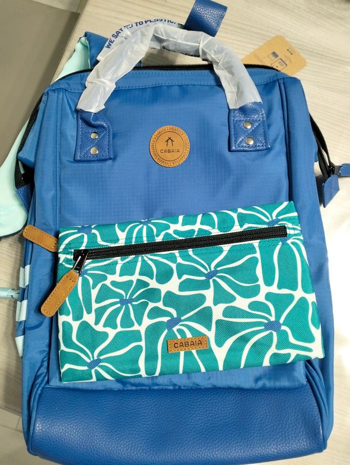 Sac cabaïa Neuf avec étiquettes Valeur: 89€ neuf Dimensions (18L) : 27cm x 41cm x 16cm Poids : 0,89kg Compartiment ordinateur : Jusqu'à 13 pouces Ce sac est accompagné de 2 pochettes interchangeables : bleu (Playa Avellana) + bleu à motifs (Playa Langosta) Composition Tissu extérieur principal : 100% nylon recyclé Tissu extérieur enduit : 100% Polyurethane Doublure intérieure : 100% polyester recyclé